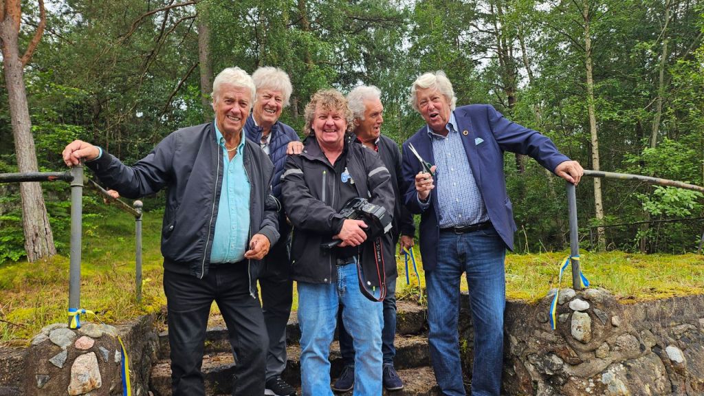 Göran och Håkan Liljeblad, jag, Bjarne Lundqvist och Ulf Elfving inviger Minnesplatsen efter Fiskebäckskilsparken på Skaftö.