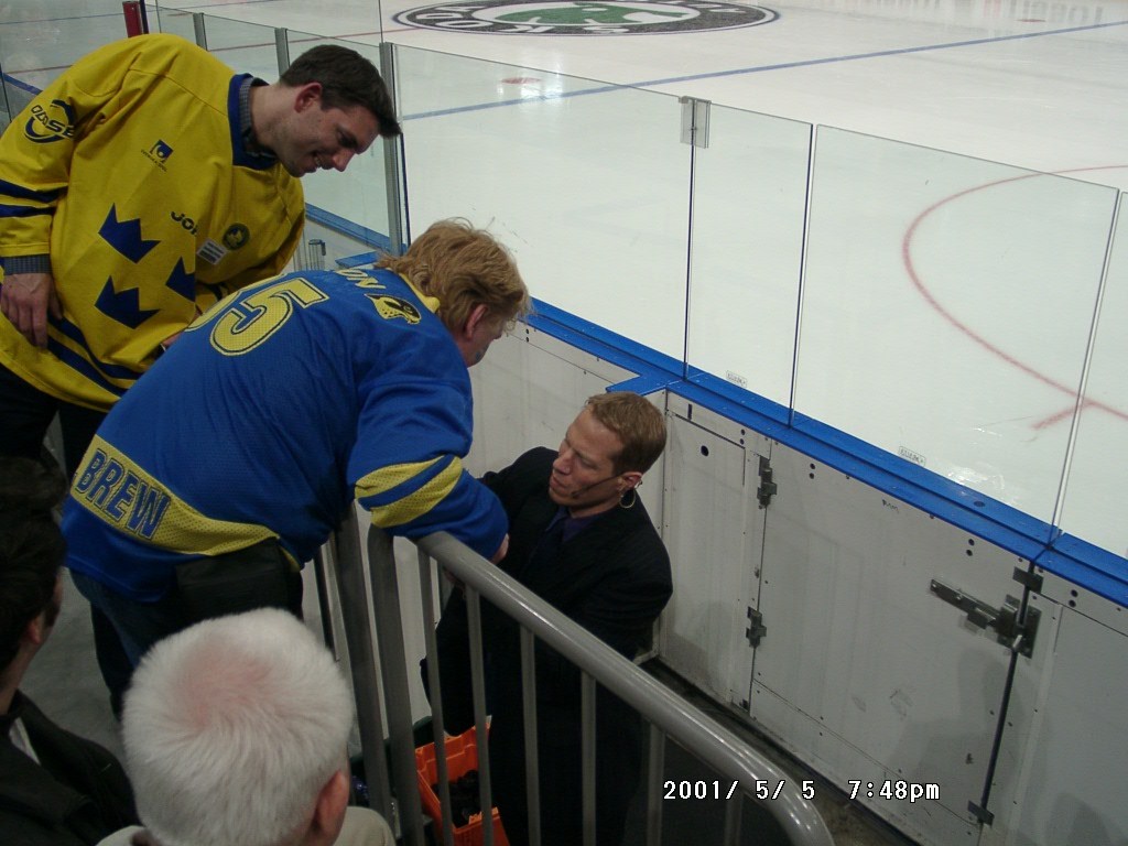Utanför Scandinavium i Göteborg. Håkan Södergren, Thomas Nordal & Jonas Bergqvist. Lämnade en målad bordhockeygubbe till Södergren.