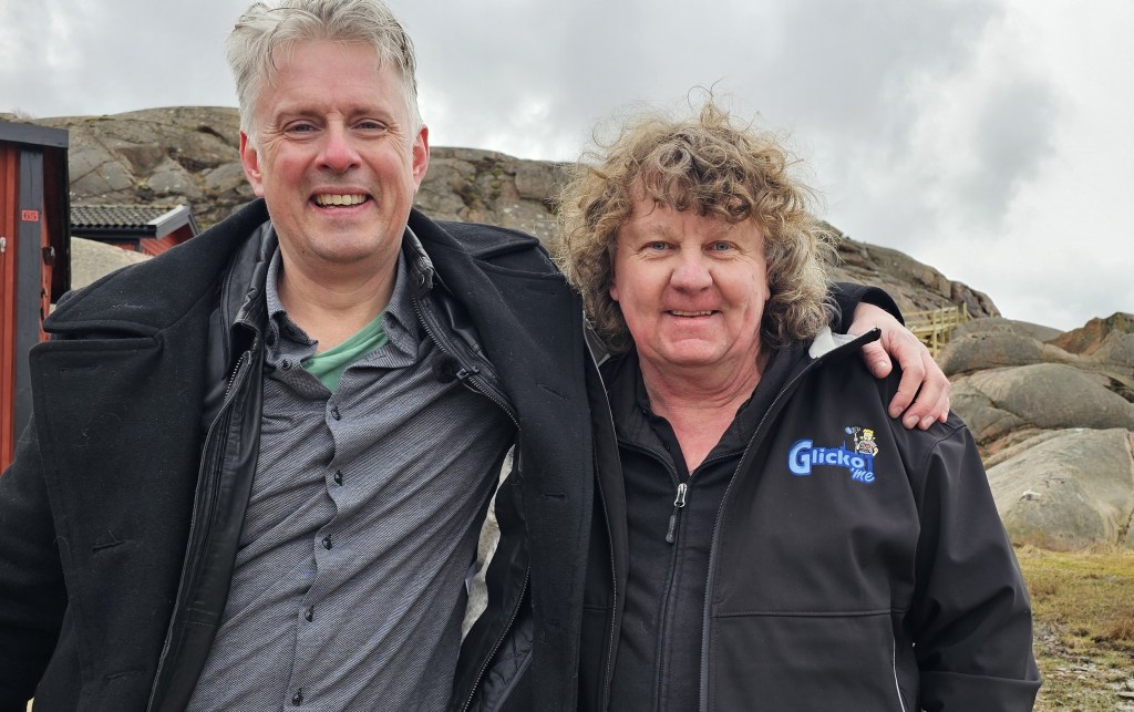 Jag och Kent Andersson vid busshållplatsen i Fiskebäckskil på Skaftö.