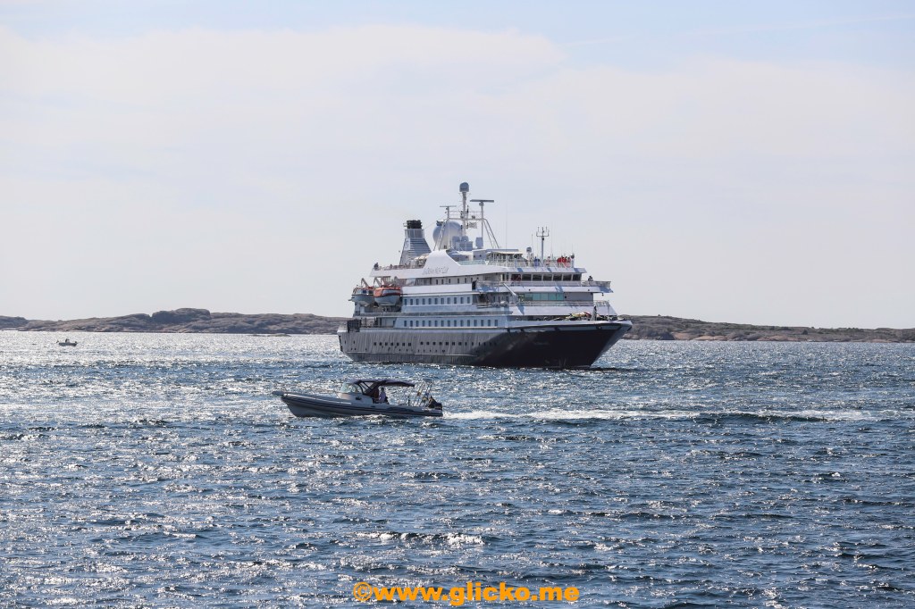 Långt bak där så kommer nästa kryssningsfartyg in till Lysekil. Efter en stund får Tor ett anrop från fartyget att det skall lägga sig i mitten av Gullmarsfjorden.