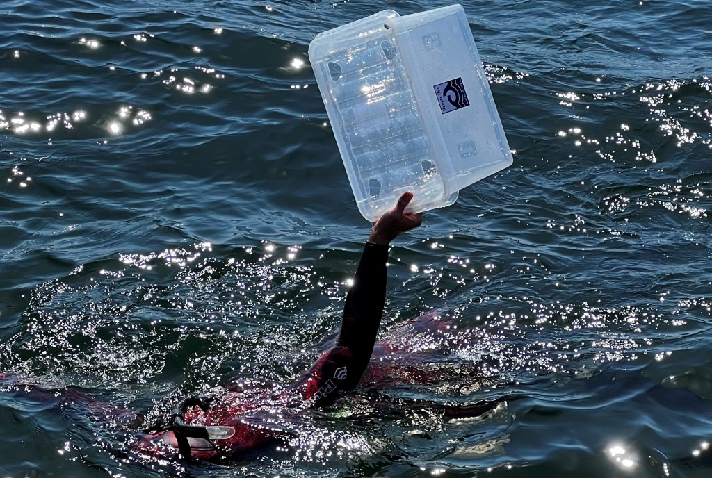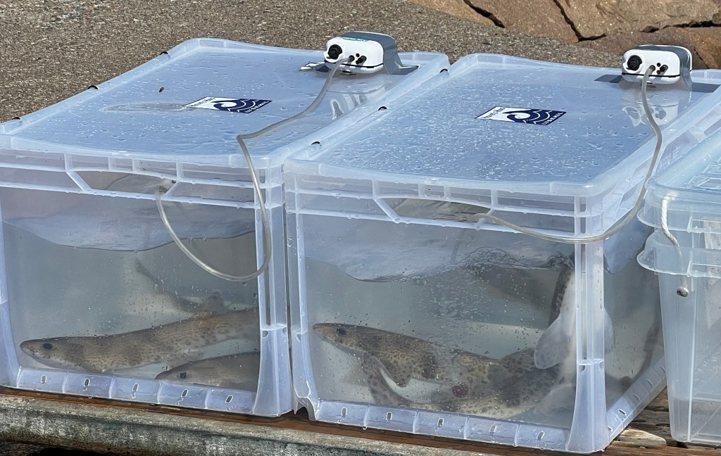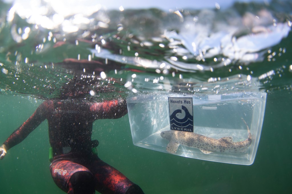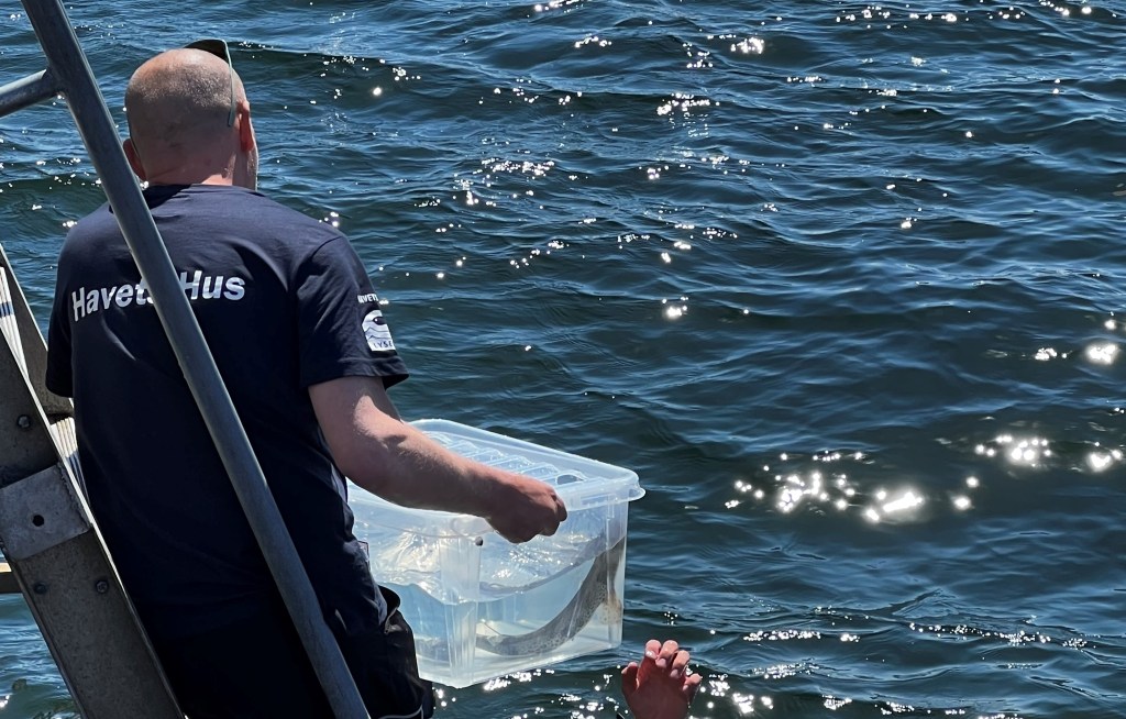 Akvarietekniker Roger Jansson lämnade över hajarna till de som släppte dem i Gullmarsfjorden utanför Havets Hus i Lysekil.