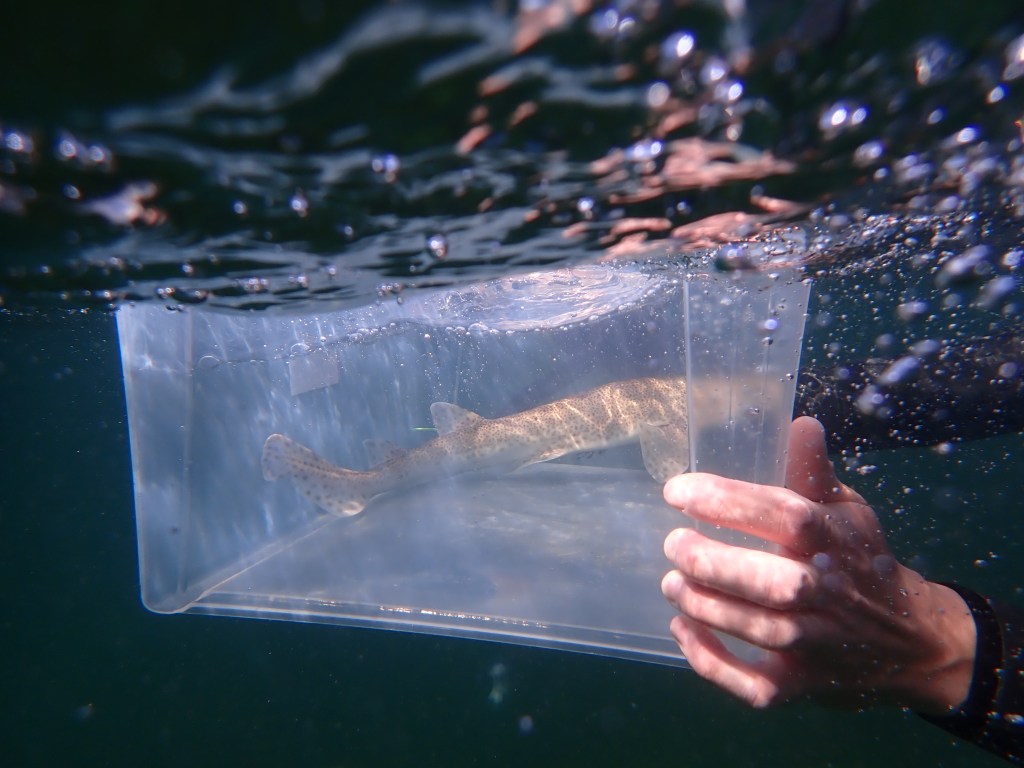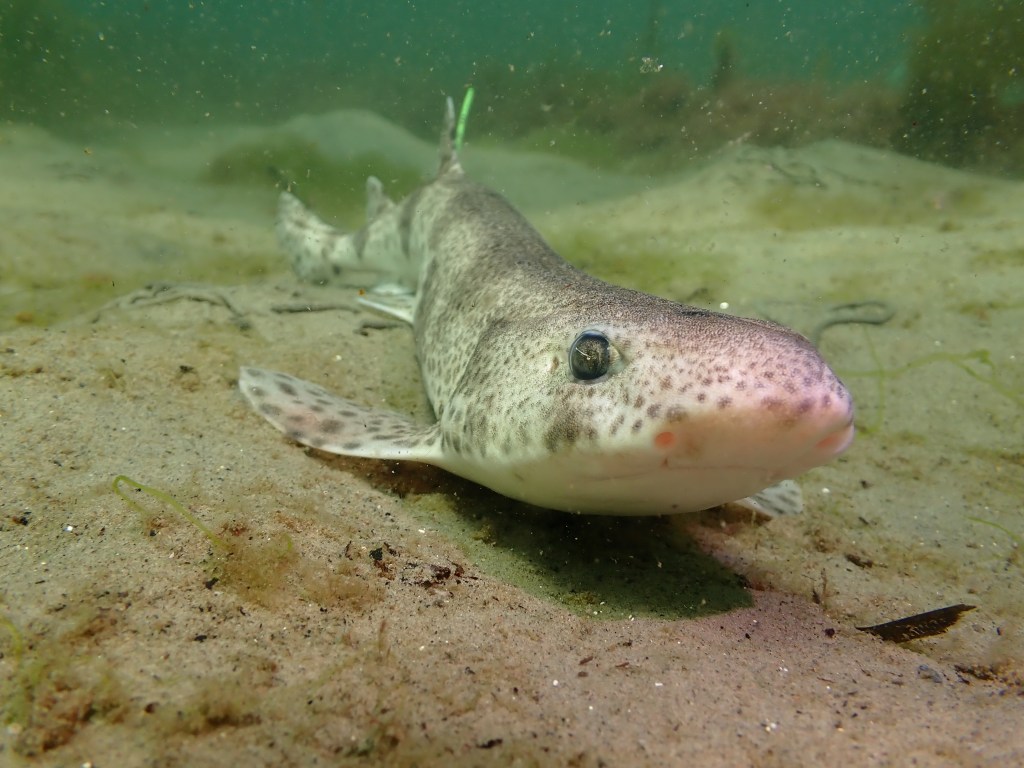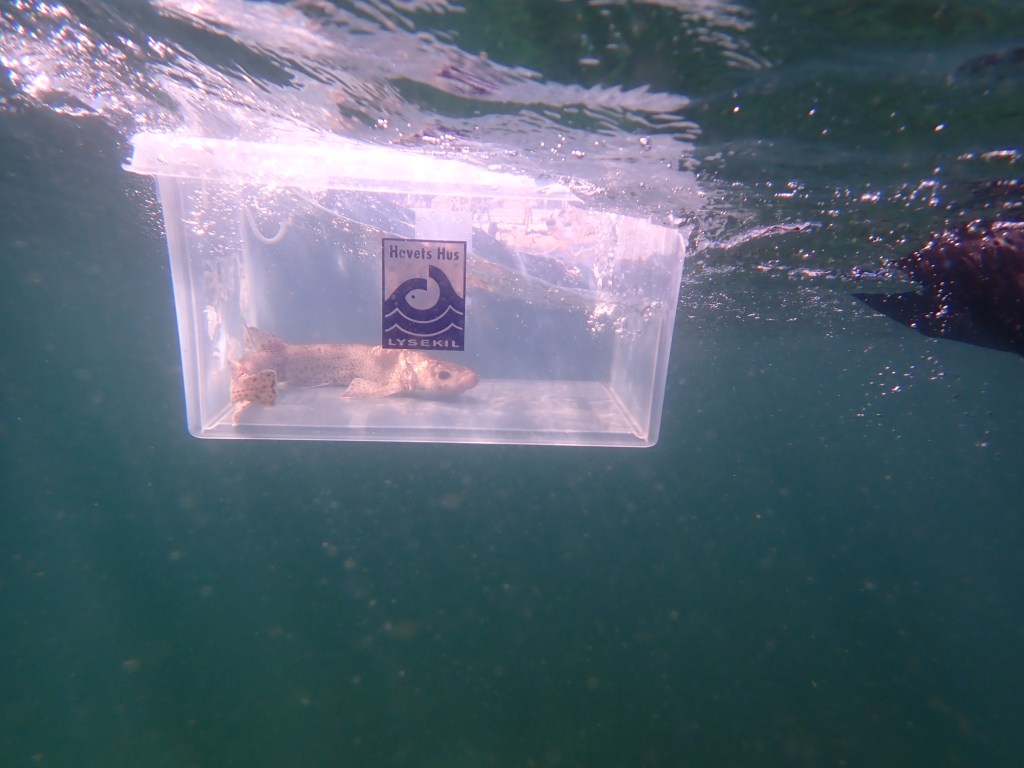 En av de tolv rödfläckiga hajarna som släpptes i Gullmarsfjorden.