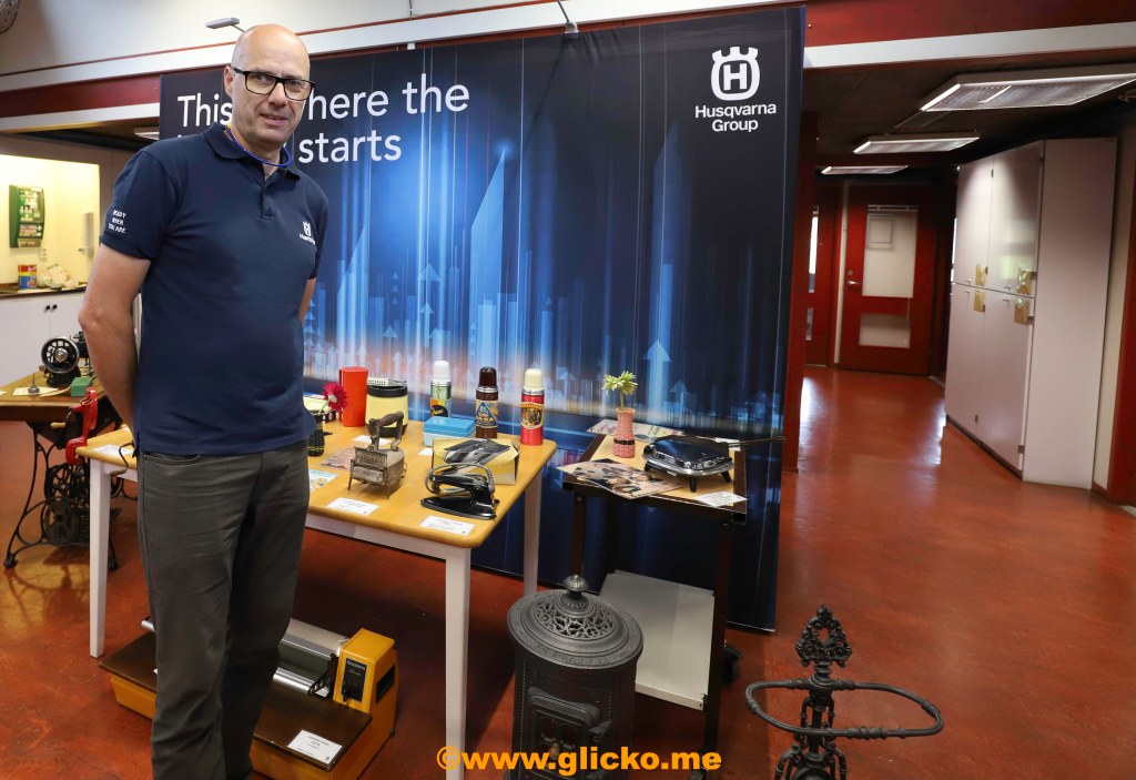 Dan Byström visade sin samling med Husqvarna saker på plats i fabriken i Brastad. Det var allt från mc till symaskin med mera.