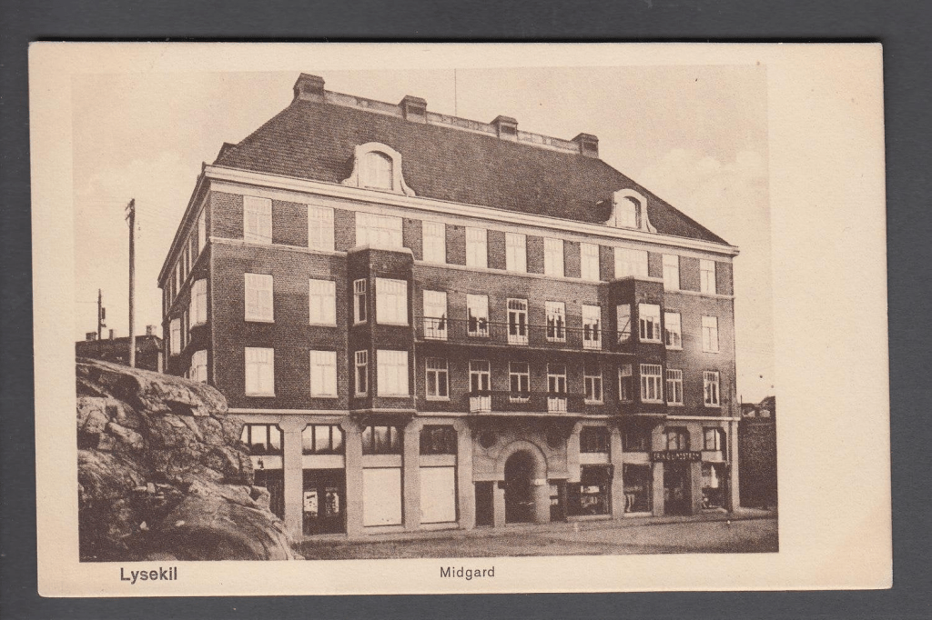 Midgårdshuset som rymde Reginateatern i lokalerna på botten, längst till vänster på bilden. Gammalt vykort.