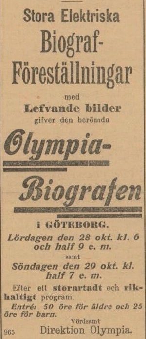 ”The biograf”-föreställningar å Folkets Hus i lördags och söndags voro synnerligen talrikt besökta. Musik, sång och tal utfördes före och efter förevisningen af ljusbilderna af en stor fonograf. Några av bilderna slogo säreskilt an på publiken, såsom ett hastigt framrusande tåg, enligt förevisaren trovärdiga framställning ”världens snabbaste, och trafikerade linjen Uddevalla-Strömstad”