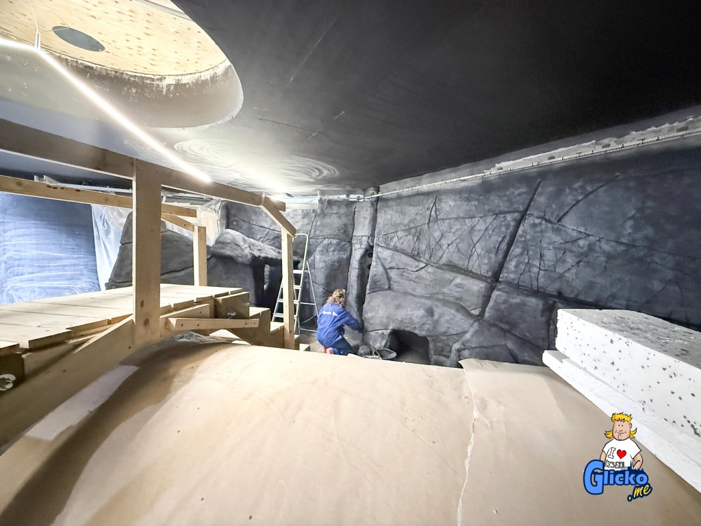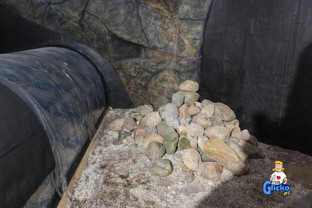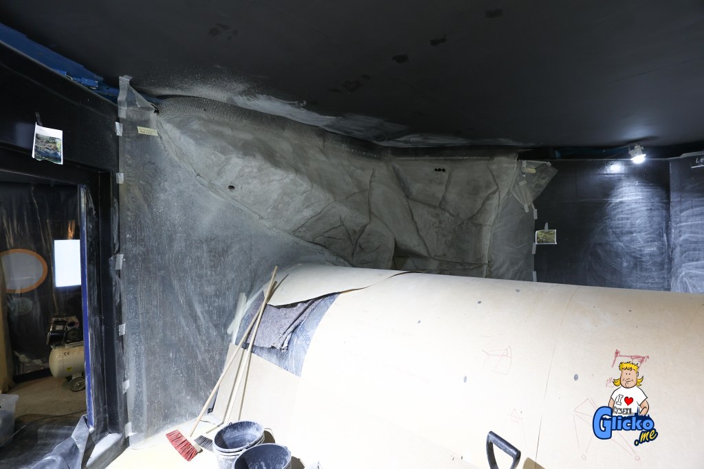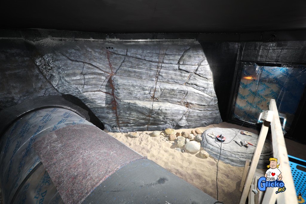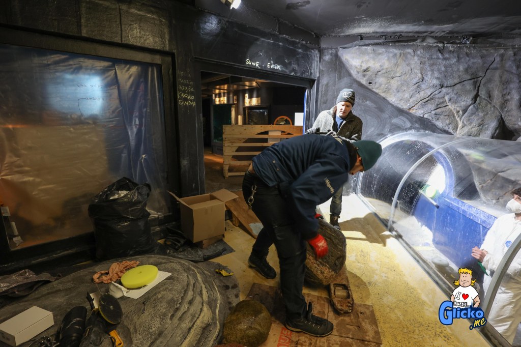 Innan poleringen av akrylplasten så var den danska firman Make Make på plats och byggde alla berg i akvariet. Företaget Make Make har även byggt det stora regnskogsträdet på Universeum i Göteborg.