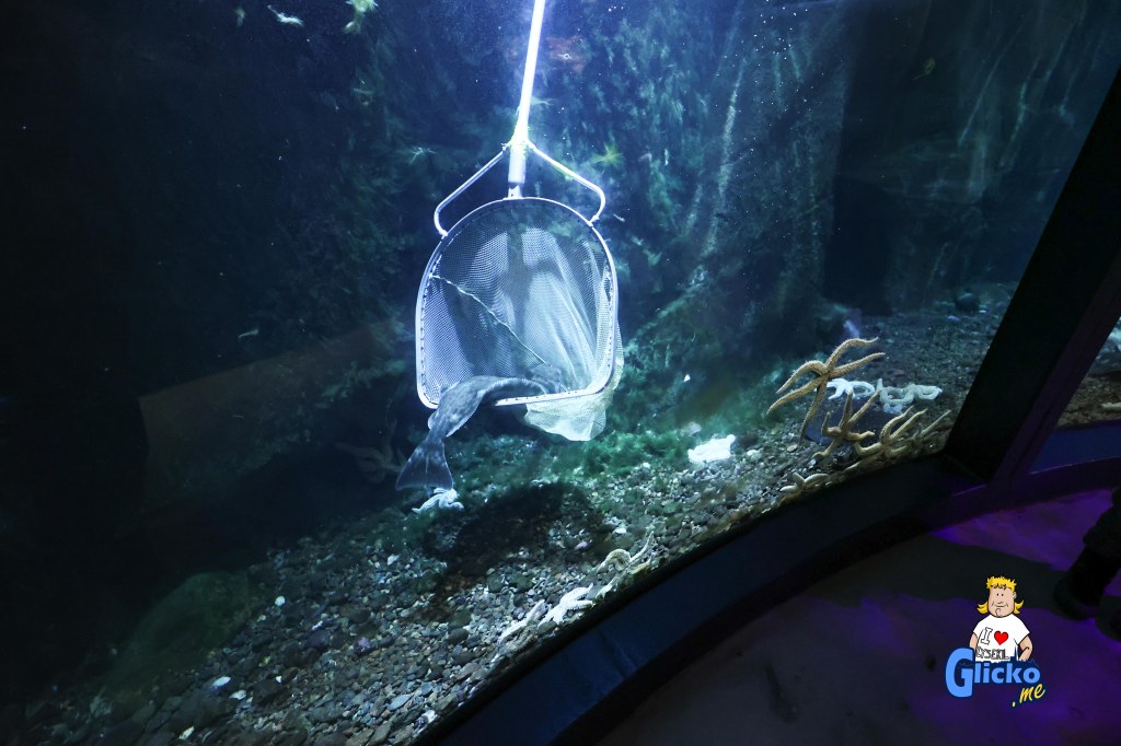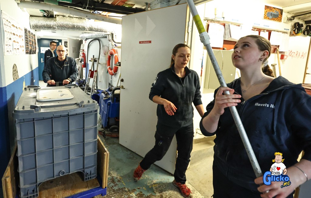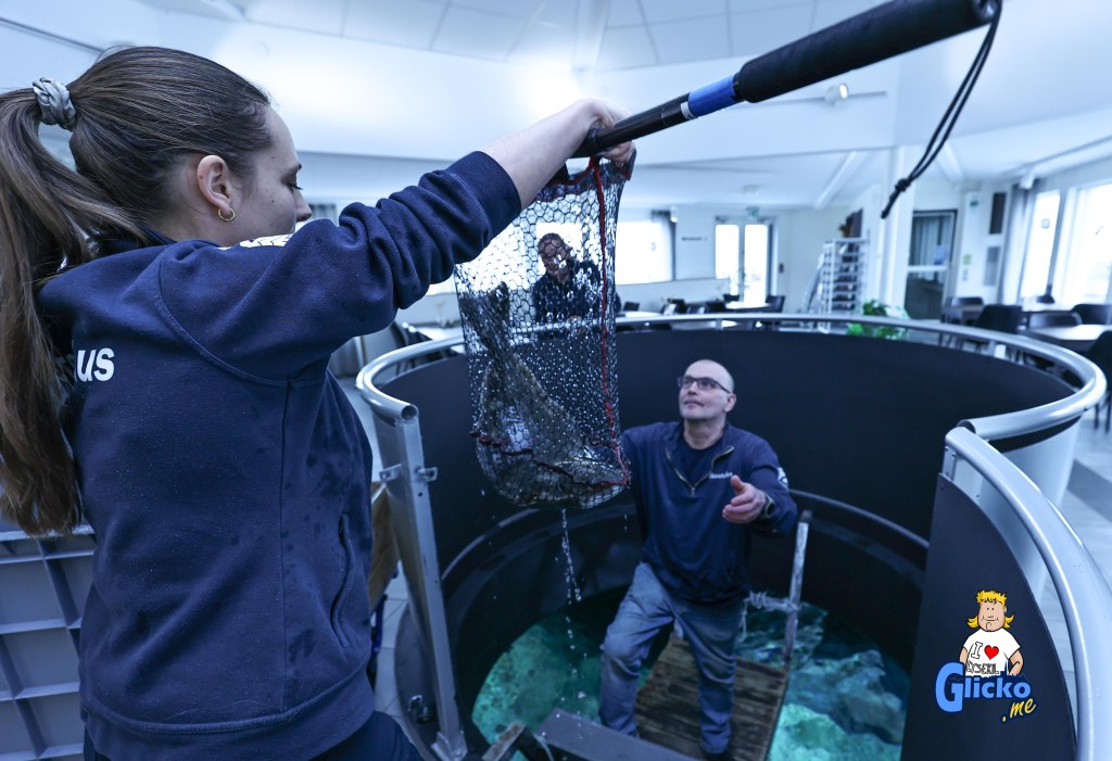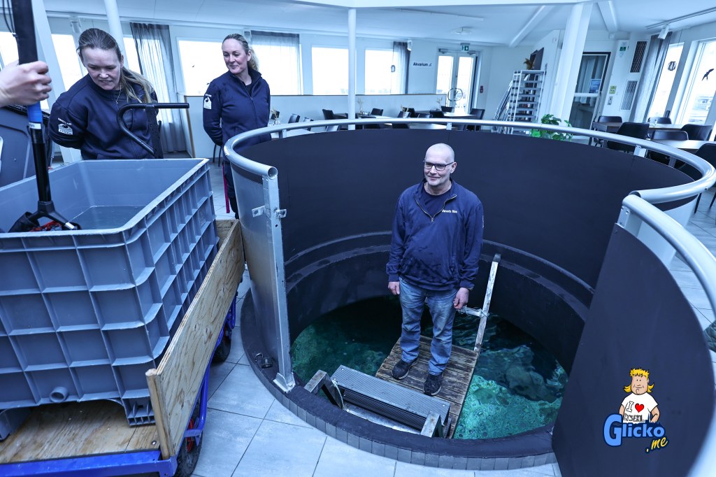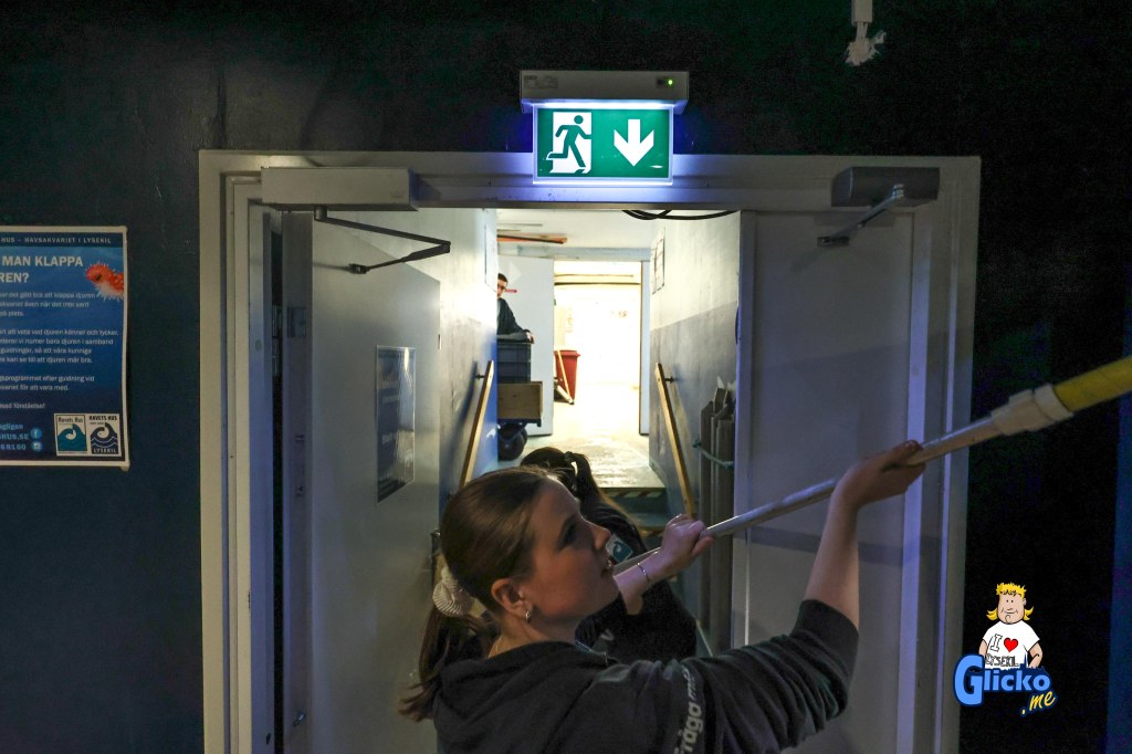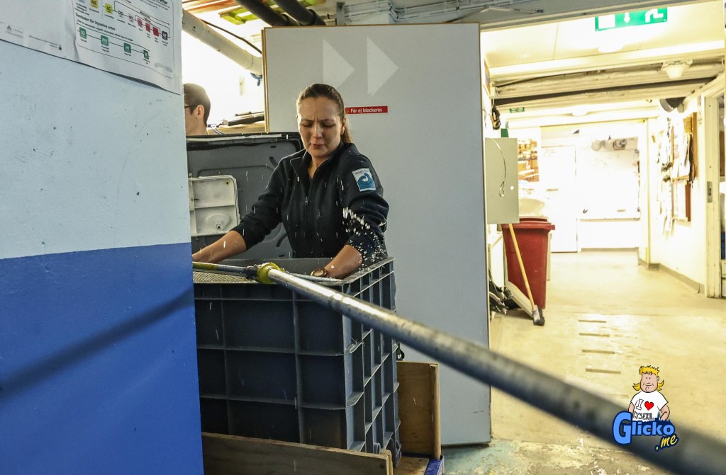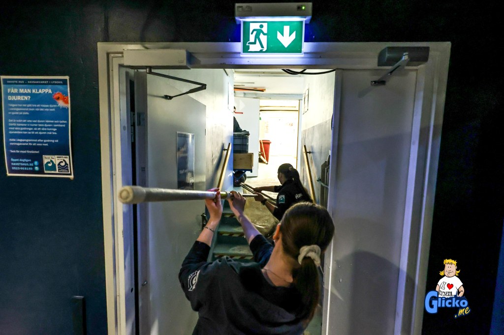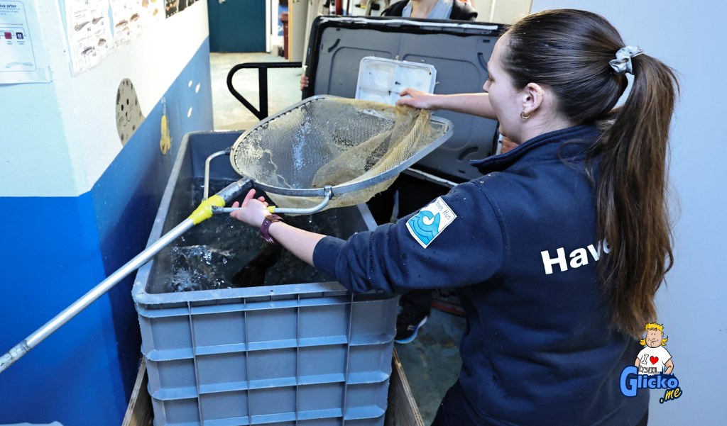Roger fångar fisken som skall till tunnelakvariet och där praktikanten Jennifer tar emot håven och lämnar den till Karolina som lägger fisken i karet som sedan Roger transporterar upp vidare för att släppas i tunnelakvariet.