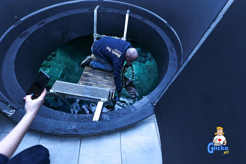 Karolina lämnar över fisken till Roger som sedan släpper ut den i tunnelakvariet.
