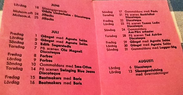 Scafell Pike 21 och 23 juli plus den 8 augusti för då skulle Gyllene Tider varit där men var dubbelbokade. Istället så spelade Scafell Pike. Jag minns detta för jag var discjockey hela den kvällen det datumet. Ola Magnell var där den 30 juli. Tror min far gjorde en intervju med honom inne i Lunnevik vid det gamla färjeläget.