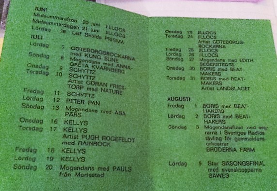 Tack för foto på programmen till Bo och Eva Frölander. Eva jobbade på Club Skaftö och träffade där Bo som var trummis i Rainrock som spelade med Pugh Rogefeldt. De blev ett par på Club Skaftö och är fortfarande i Fiskebäckskil varje sommar.