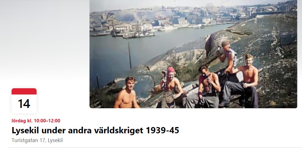 Vikarvet: Föredrag om Lysekil under beredskapsåren. Lars Melkersson visar bilder och berättar om dessa spännande år av 1900-tals historia. Kaffe/Te och smörgås serveras. Entré 100kr (svisch eller kontant)