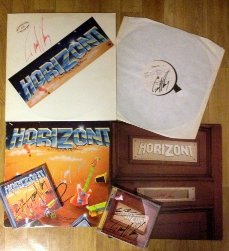 Skivan längst uppe till höger är ett prov ex från Horizont 2:a skiva ”Andra vyer” har även alla singlarna med Horizont. Sen har jag även en samlingsplatta från Tonkraft där Horizont medverkar med en liveinspelning. Tommy berättade att tack vare den radiospelningen så fick Horizont skivkontrakt.