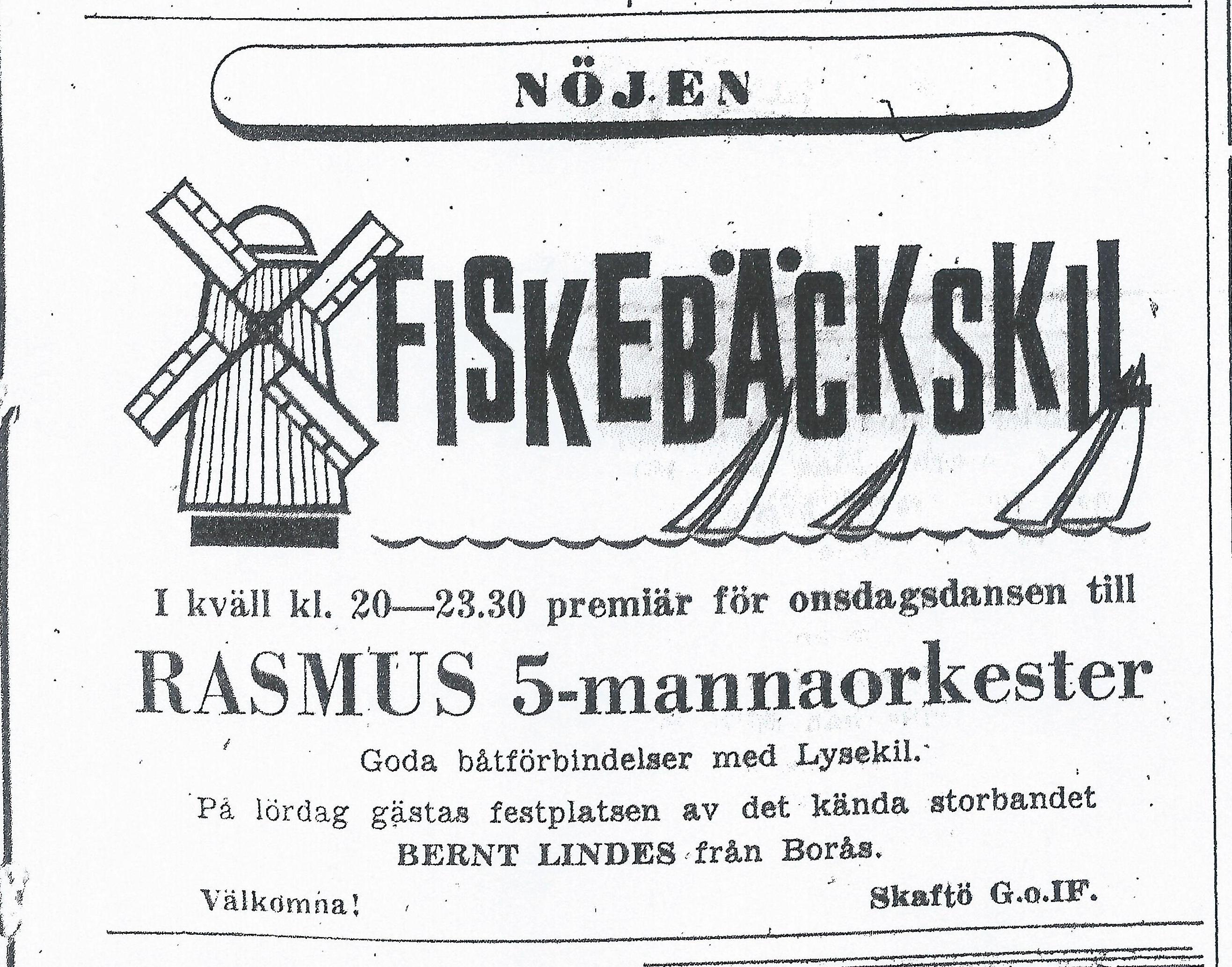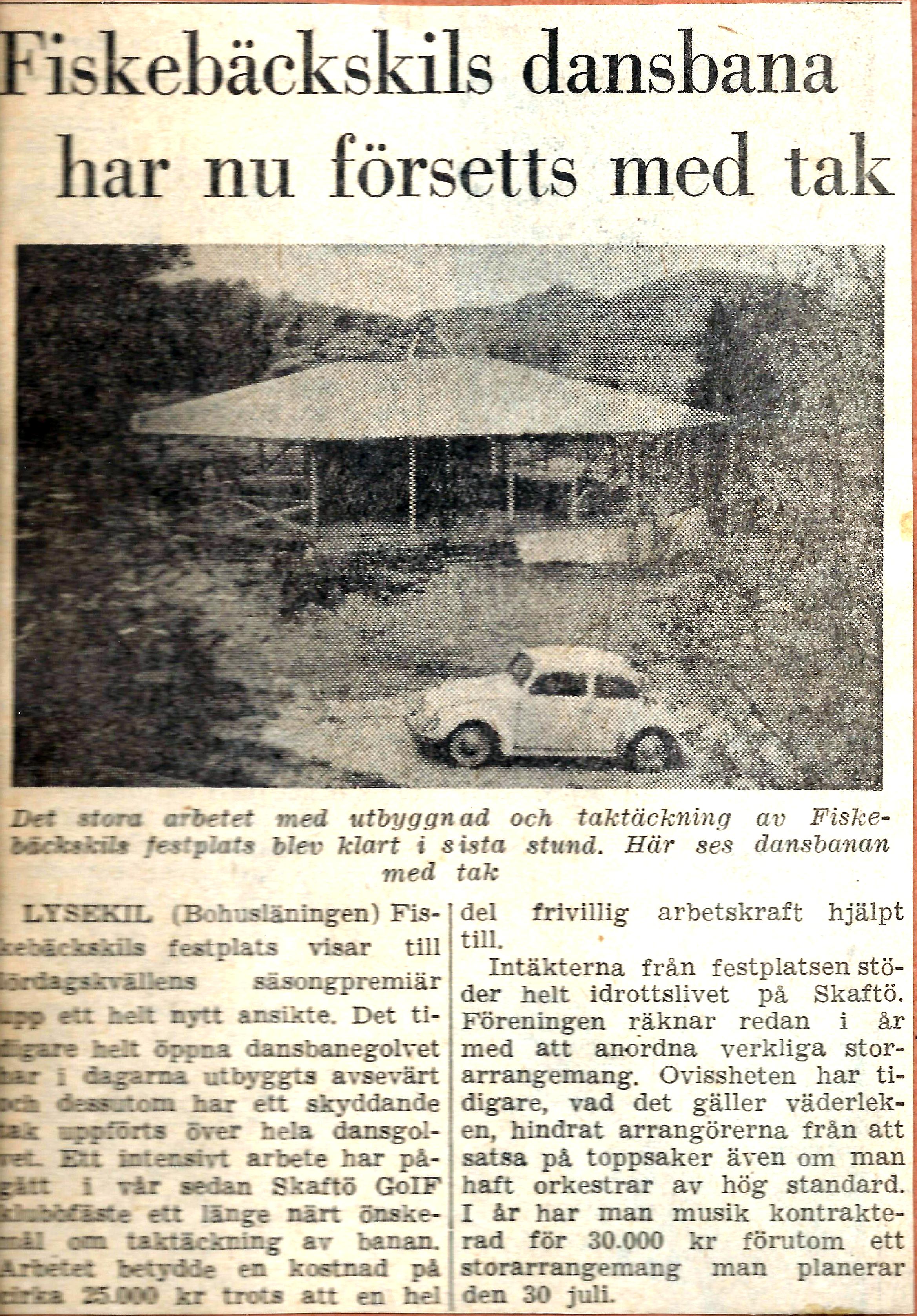 25 mars 1944. Mötet godkände festkommitténs förslag att bygga en serveringsterass samt ny kiosk vid Fiskebäckskils dansbana.