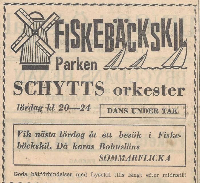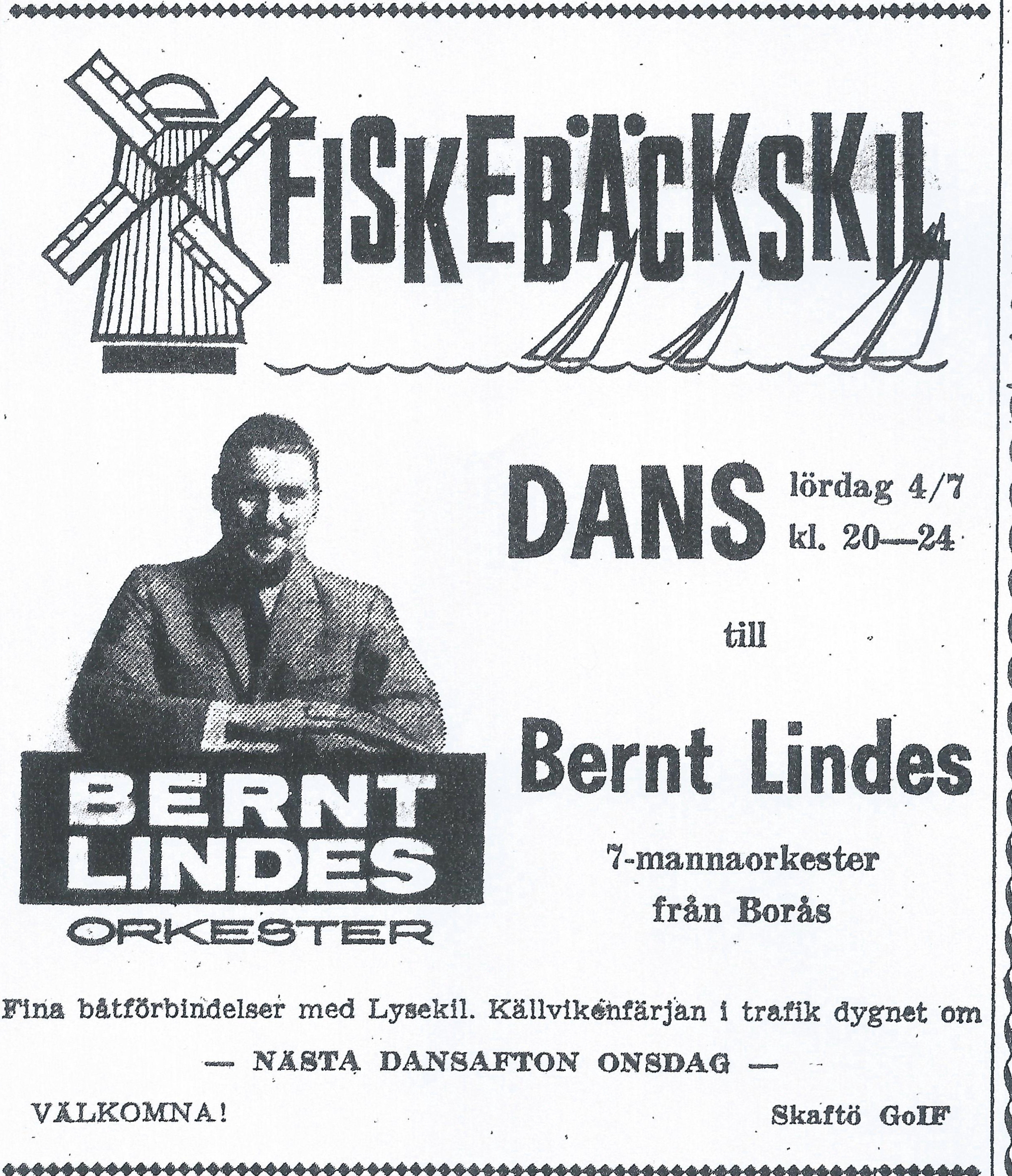 Landsfiskalen i Orust utfärdade tillståndsbevis till John-Henrik Gren för offentlig revytillställning med dans med Spelmansflickorna med Anna Öst torsdagen den 6 juli 1950.