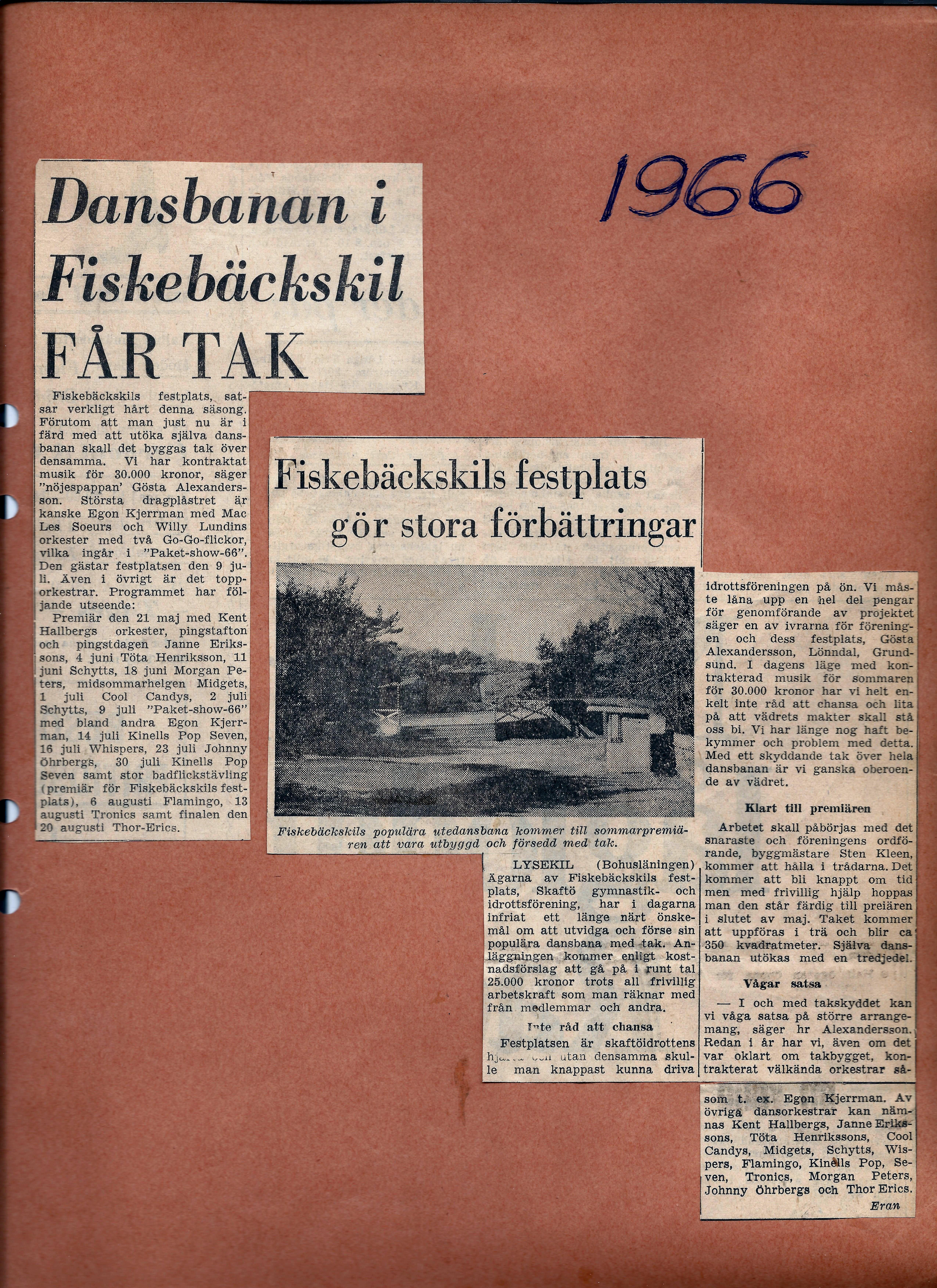 5 december 1965. Styrelsen godkände Stig Alexanderssons ritning rörande takläggning på festplatsen. Jag kom i kontakt med Gösta Alexandersson som berättar att han kom med och började boka artister till parken någon gång i början på 60-talet. Med då var också Bertil Wikström och John-Olof Olsson. Gösta minns att då var det danskvällar på onsdag, lördag och söndagar i parken på sommaren. De var band från Uddevalla, Trollhättan och Vänersborg berättar Gösta. Det första bandet Gösta bokade till Fiskebäckskilsparken var Douglas Holmstedts Orkester. Danserna på onsdagar och söndagarna lönade sig inte berättar Gösta så de la ner dem.