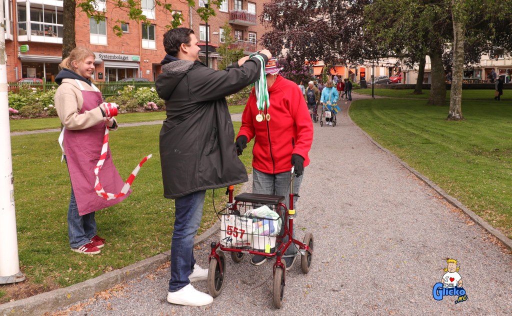 Första deltagaren på igång som fick en medalj i rullatorrallyt.