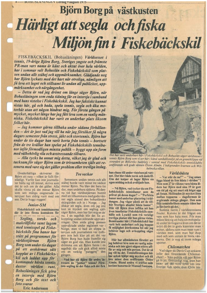 I augusti 1975 var Björn Borg på besök i Fiskebäckskil och min pappa Eric ”Eran” Andersson fick en intervju med Björn Borg. Pappa hade fått nys på att Björn var på plats och lämnade ett skriftligt brev om att få göra en intervju och att den inte skulle komma ut innan han hade lämnat Fiskebäckskil. Björn tackade ja och här kommer lite foton från det tillfället som pappa tog. Som kuriosa kan nämnas att Björn bokade med namnet Svensson på tennisbanorna i Fiskebäckskil tidigt på morgnarna för att inte väcka någon uppmärksamhet att han var där.