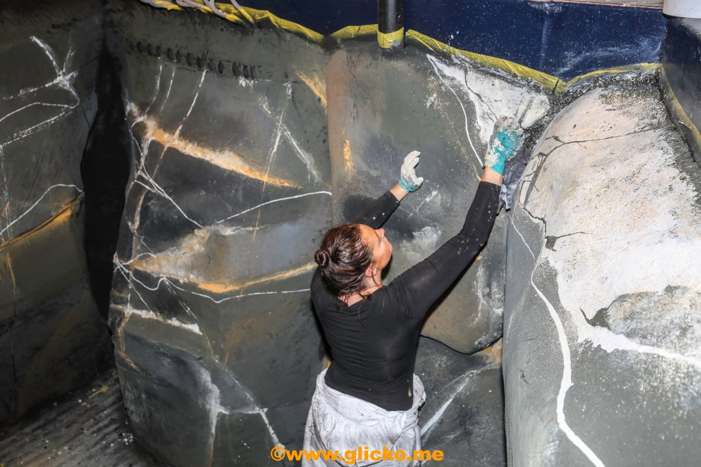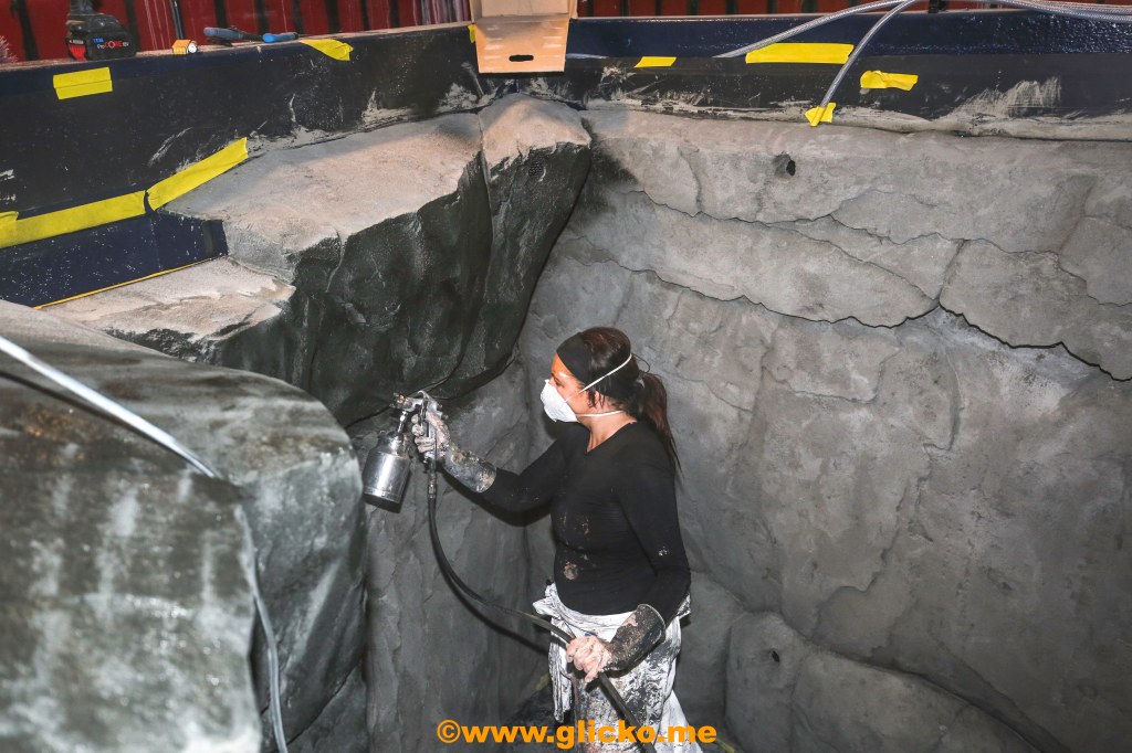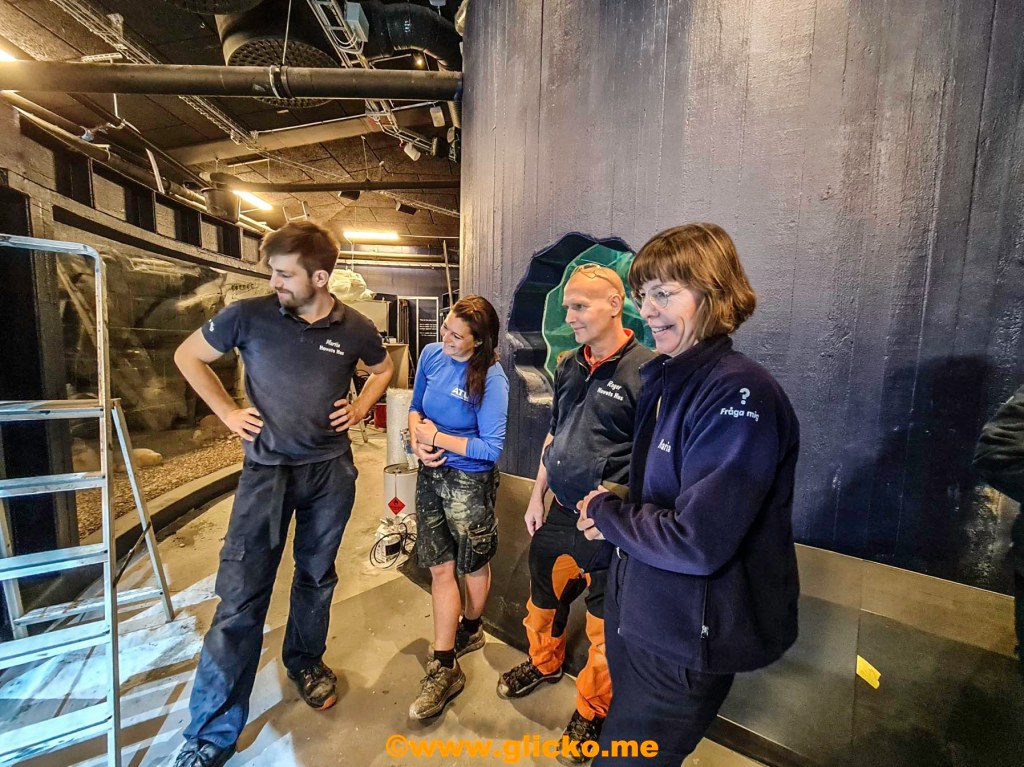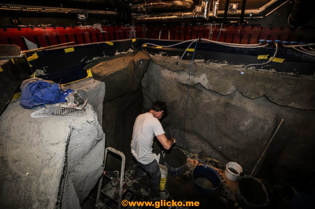 Personal från företaget ATL Aquarium Technology Limited har byggt klart grunden på inredningen i akvarierna. Efter att det var klart så kom Sarah från ATL i England och började med att lägga färgen på undervattensklipporna och så otroligt fint det blivit.