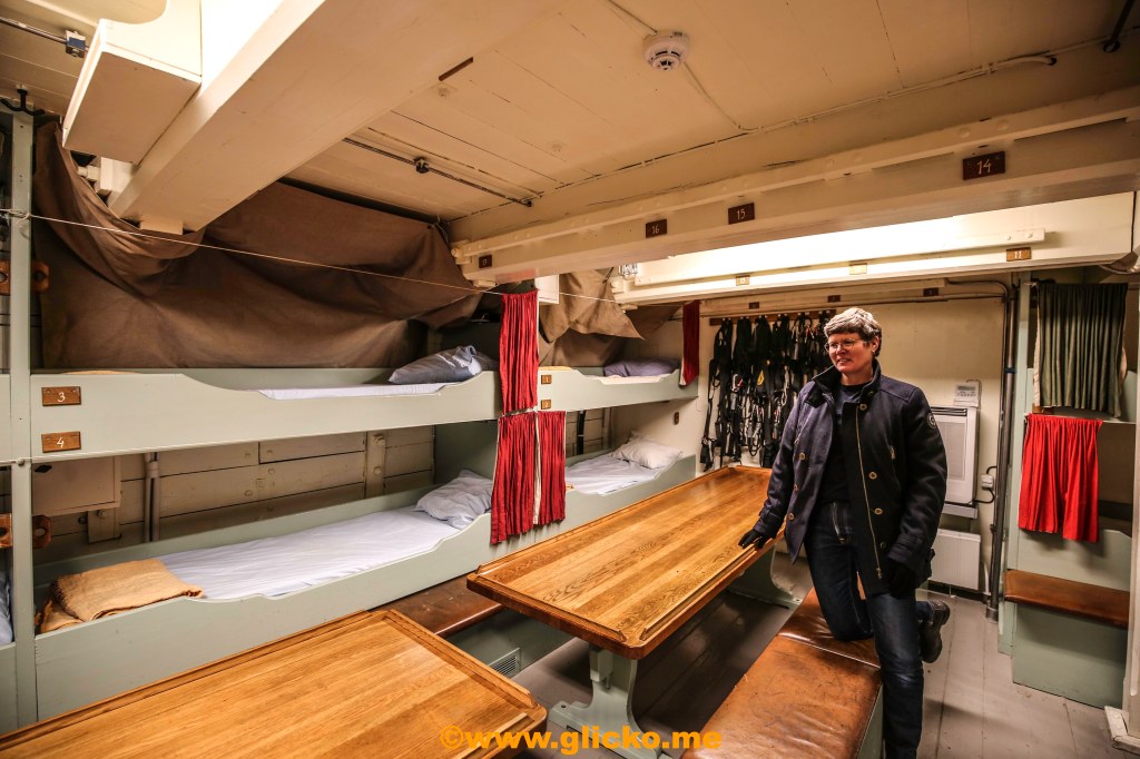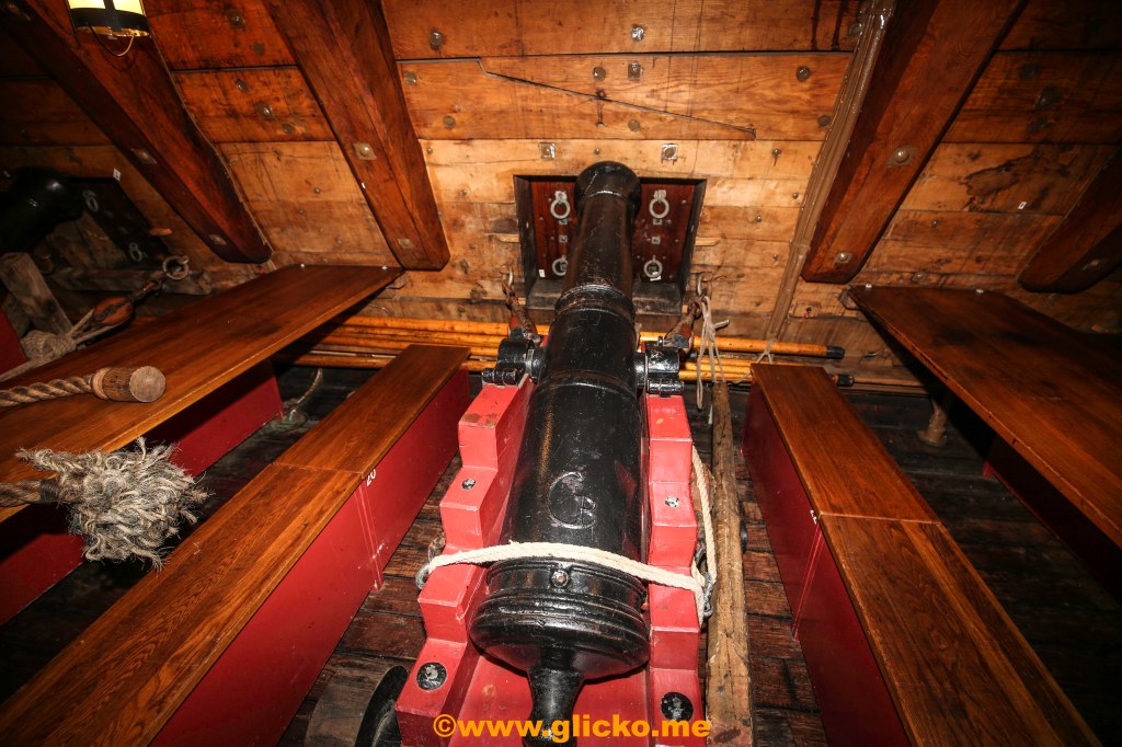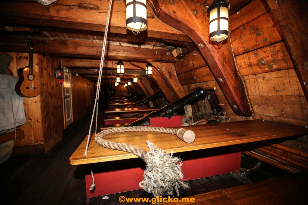 Nu går vi ner till skansen där babordsvakt bor vid de röda gardinerna och styrbordsvakts vid de gröna gardinerna. Vid varje vakt så är det 17 personer. I skansen finns även hängkorgar som fästes i taket som man sover i.