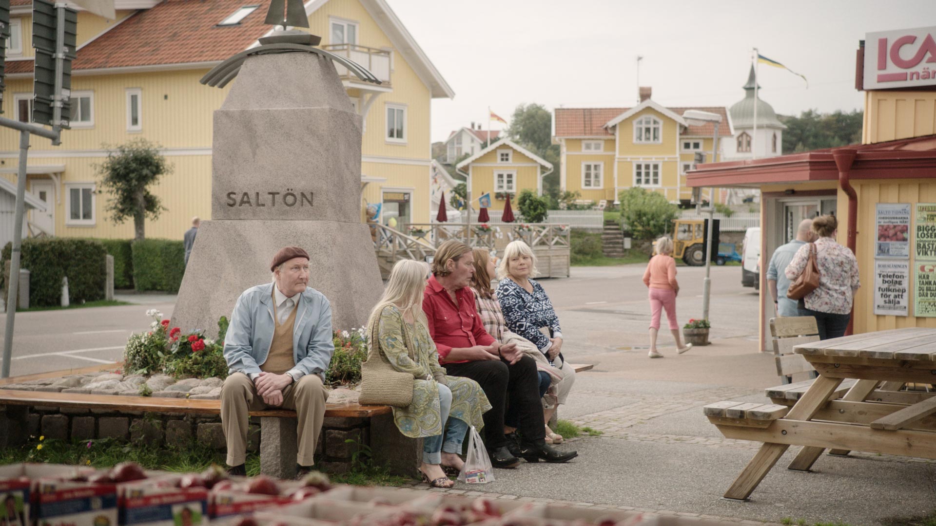 Foto från inspelningen vid torget i Grundsund med Saltöstatyn i bakgrunden. Fotograf: Nille Leander.