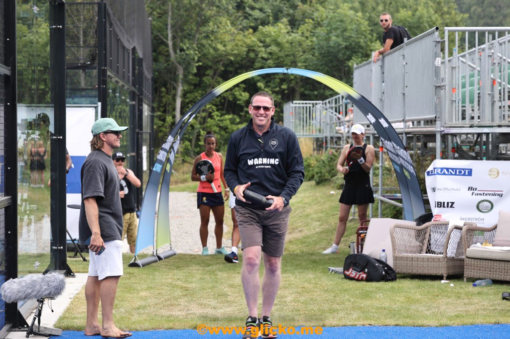 Padeldomaren Peter Clays på väg in på banan och konferencier Patrick Persson till vänster i bild som fick igång publiken under tävlingen