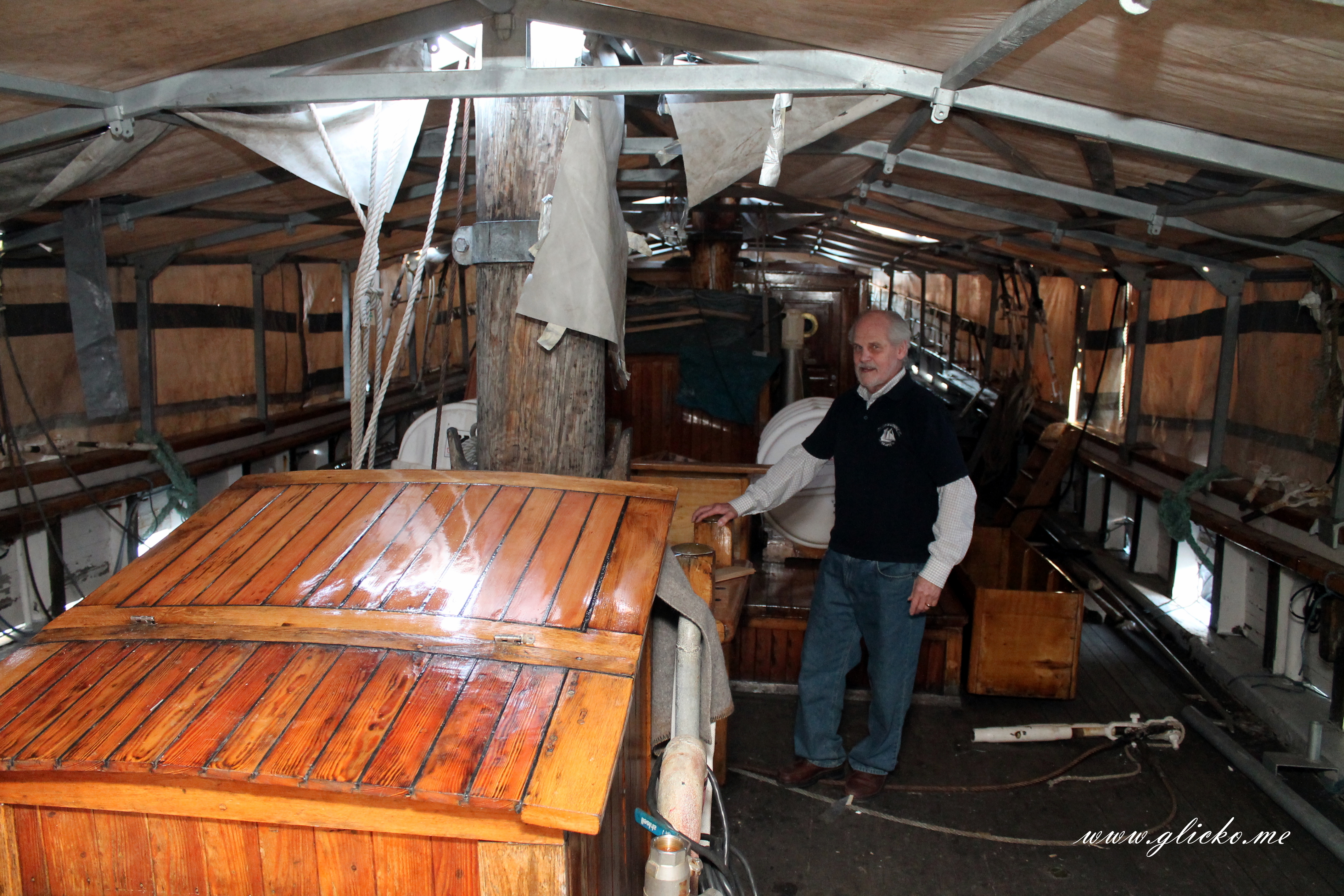 Wiggo med en ”räckstötta” som är ett kraftigt stycke trä som till sin halva längd finns över däcket och är kopplad till lästången. Den undre halvan under däcket längs fartygets spant och bidrar till skrovets styrka. De bytte fyra stycken räckstöttor på senaste varvsjobbet.