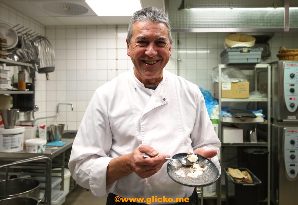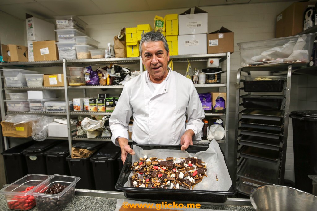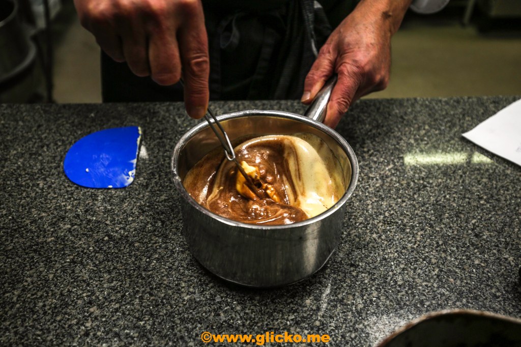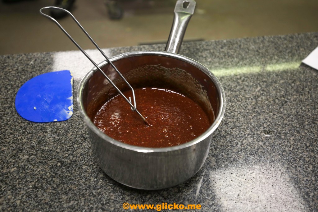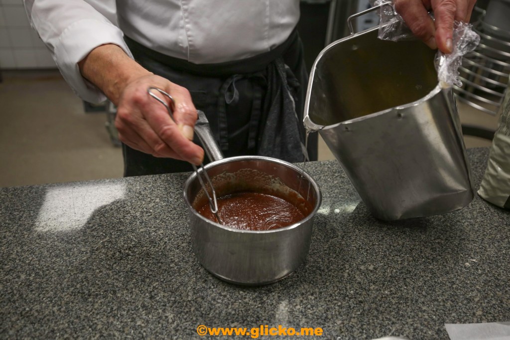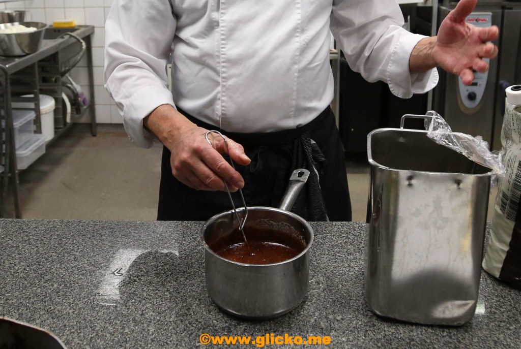 Det är bra att veta hur man löser detta om kolasåsen skär sig. Har man för hög halt av choklad så kan det skära sig. Chokladen behöver socker för att stabilisera sig. Om den skär sig så kan man fixa detta med ett sockerlag eller också sprit säger Frasse och skrattar.