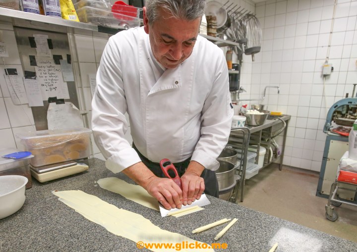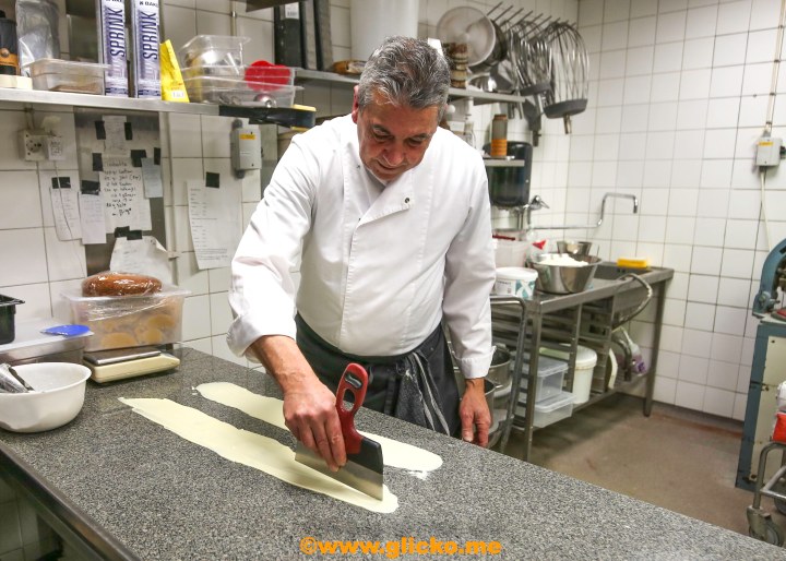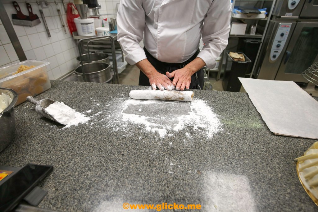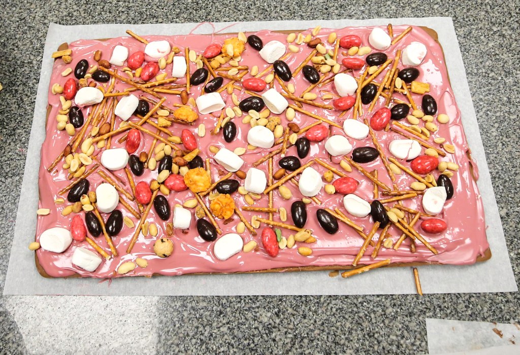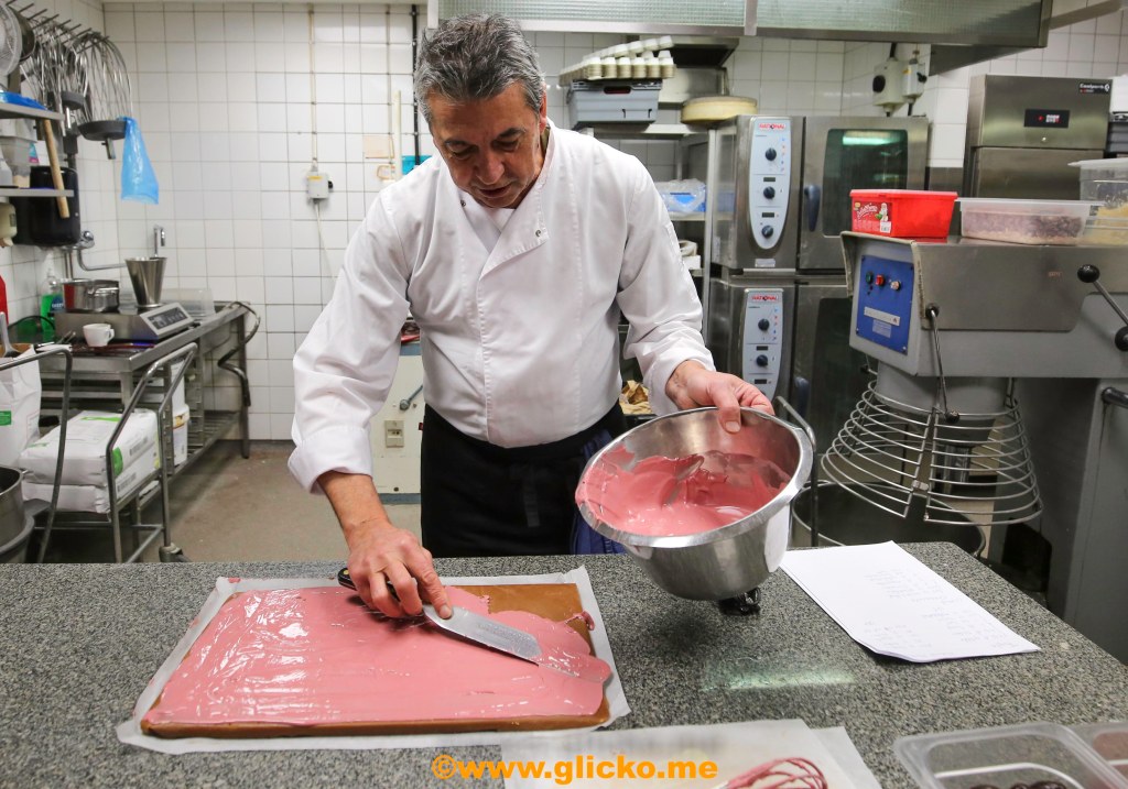 Han breder även ut den vita chokladen på marmorbänken och låter den stelna och gör sedan klart pennorna till tårtan.