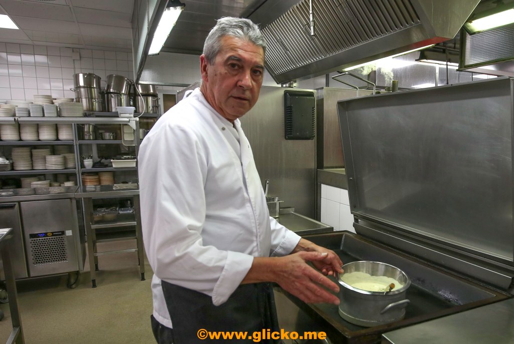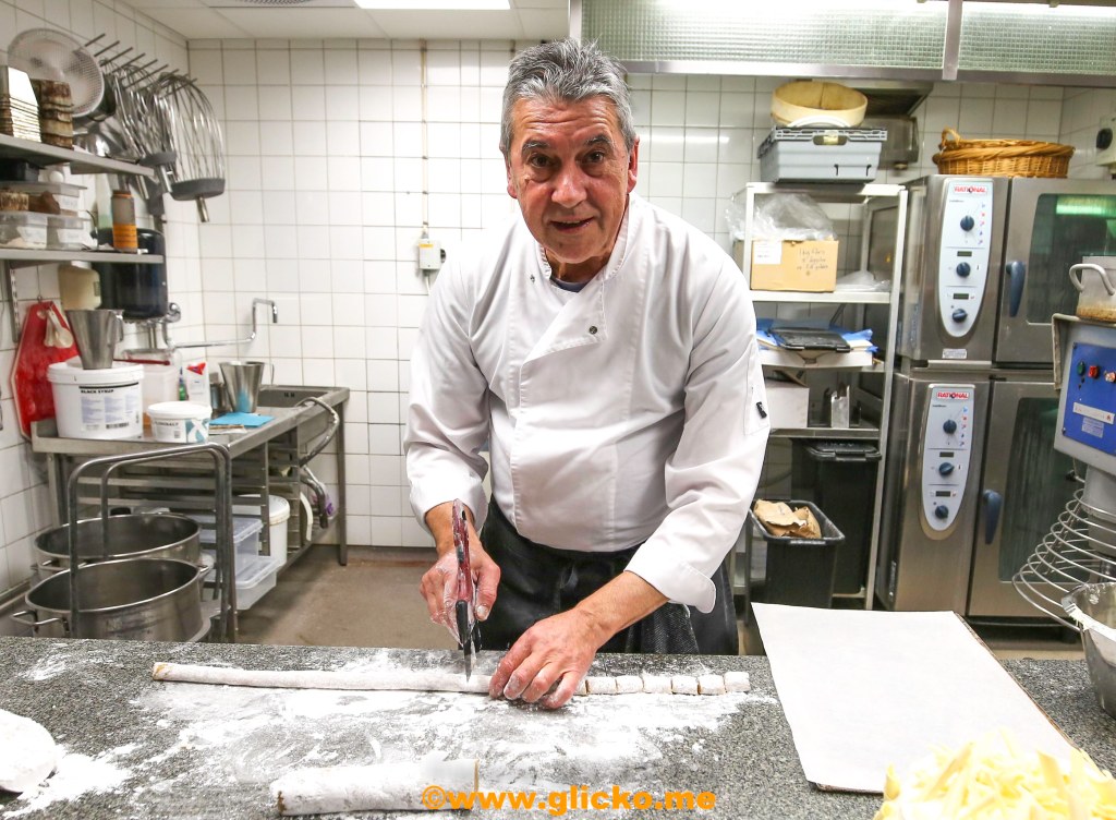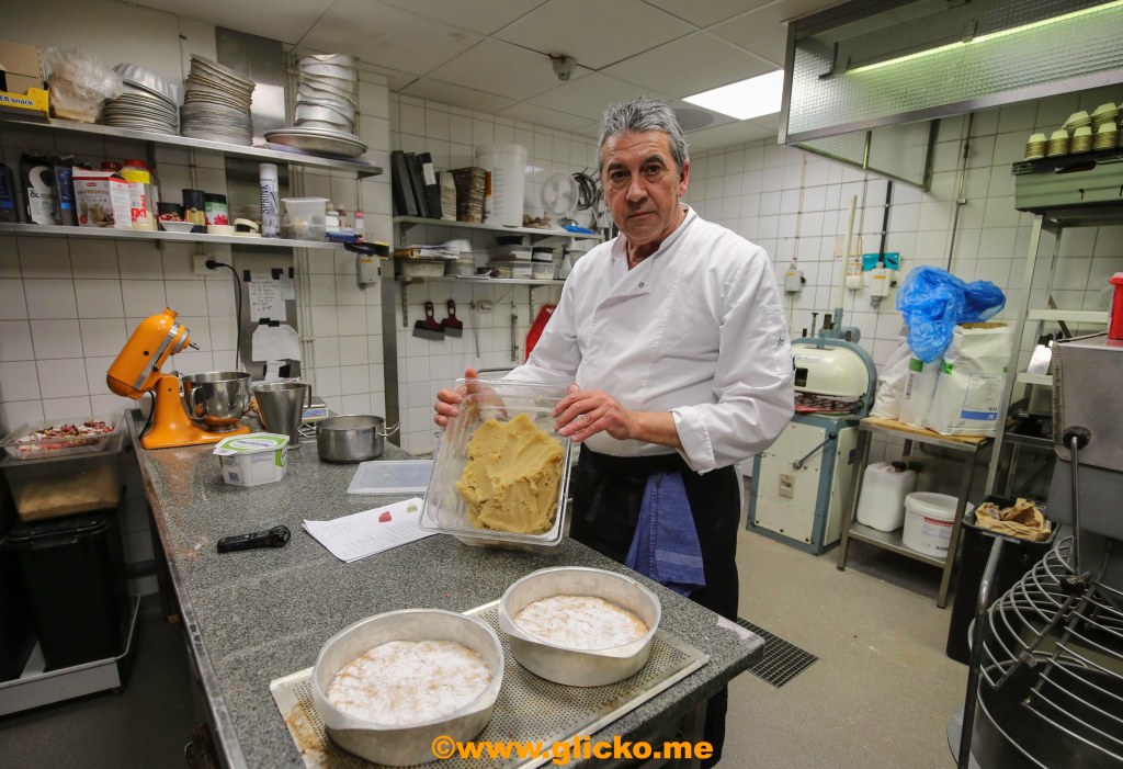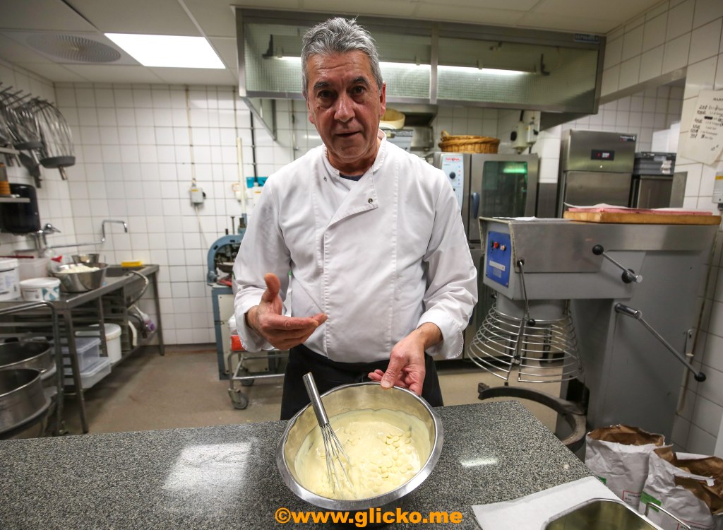 Frasse startar med att göra en kolasåsfyllning som vi gör av äggen där vi sparar äggvitan för att göra själva marängen. Problemet när man gör en kolasås så kan det hända att den skär sig, och det beror på vilken kvalité av choklad man använder. För att slippa detta så skall man egentligen använda en choklad som har en kakaohalt av 60-65 %