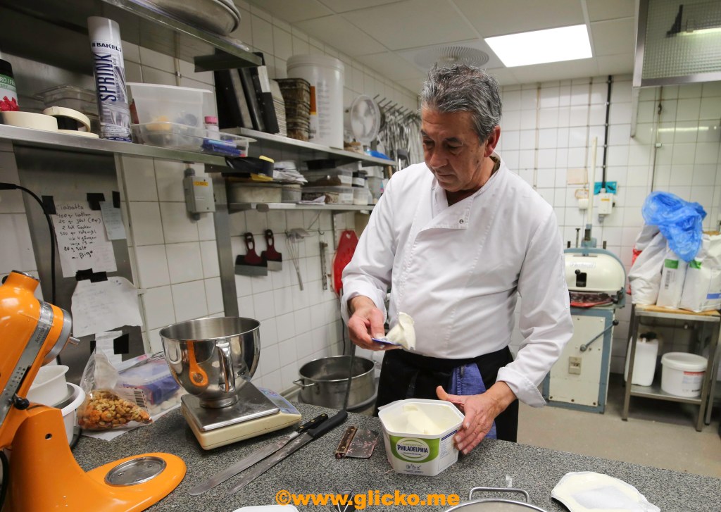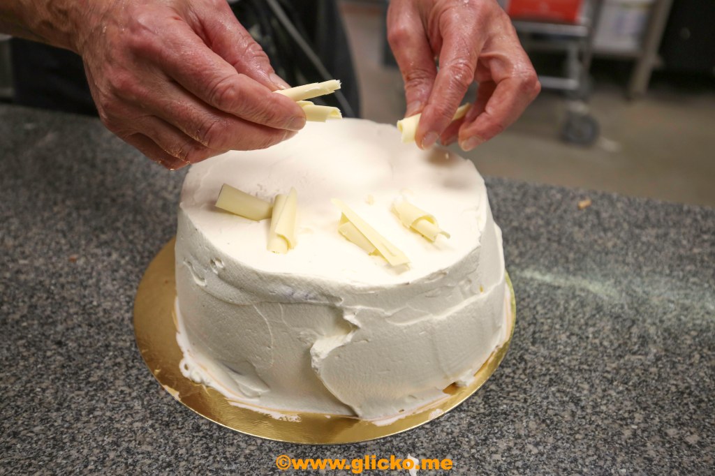 Efter det smetar han grädde ovanpå och runt hela tårtan.