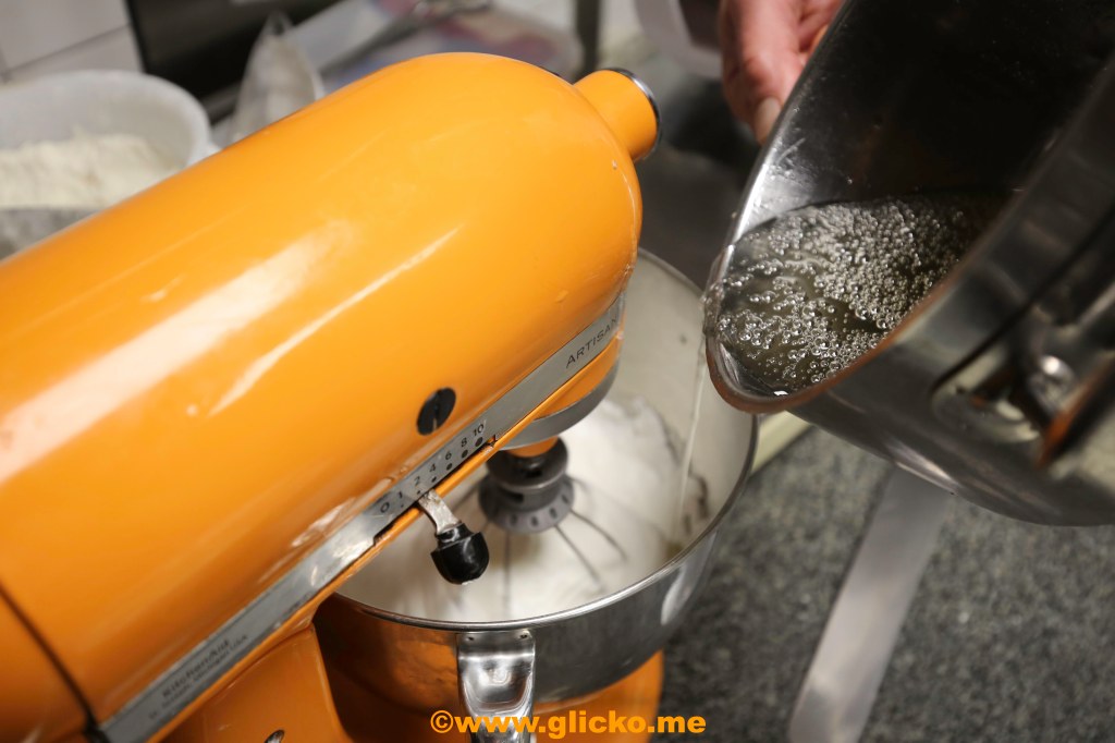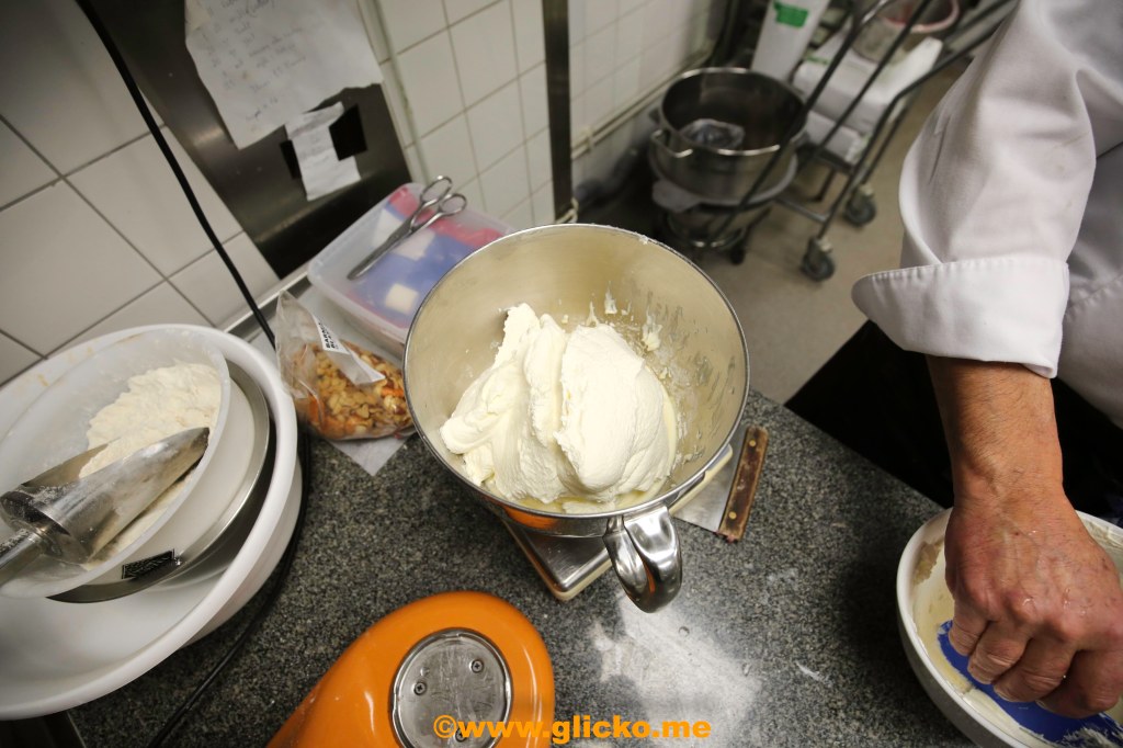 För att kolla chokladen så att den har rätt temperatur så tar Frasse vispen och doppar lite försiktigt i chokladen och den vita chokladen skall stelna inom 1 – 2 minuter max. När Frasse gör marängbottnarna, så brukar han vispa ihop 100 gram äggvita och 200 gram socker. Marängen tar cirka 2 timmar i ugnen innan den är klar.