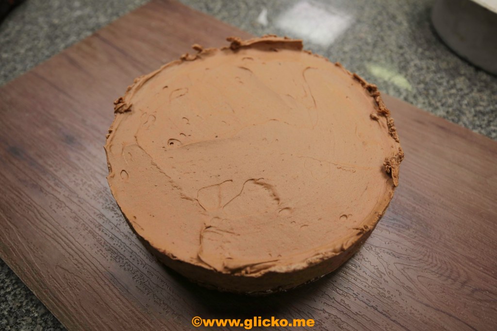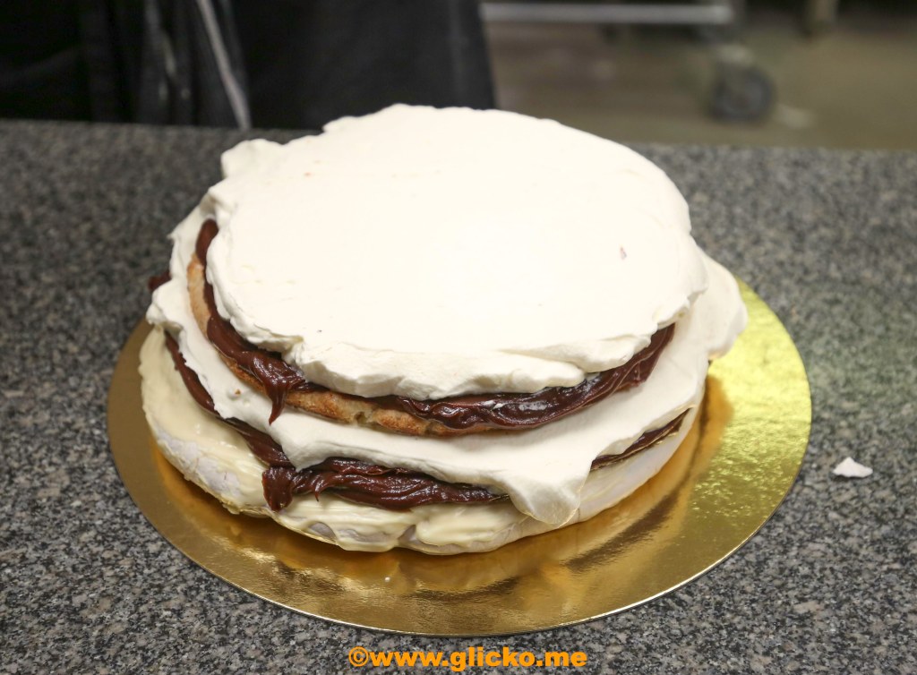 Frasse har även förberett en vanlig sockerkaka till tårtan. Nu början han smeta kolasåsen på marängbotten och sedan tar han även ett lager med vispgrädde.