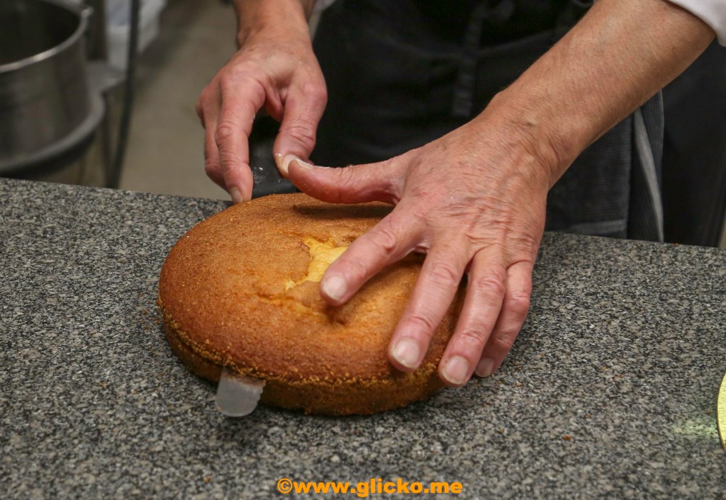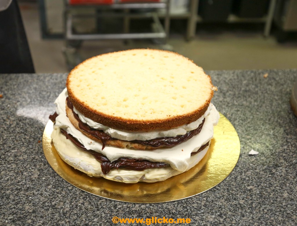 Sedan lägger han på mandelbotten och även där ett lager med kolasåsen och vispgrädden. Nu delar han sockerkakan och man känner doften av citron sprida sig i köket och lägger på den överst, och smetar kolasås och vispgrädde på översta lagret.