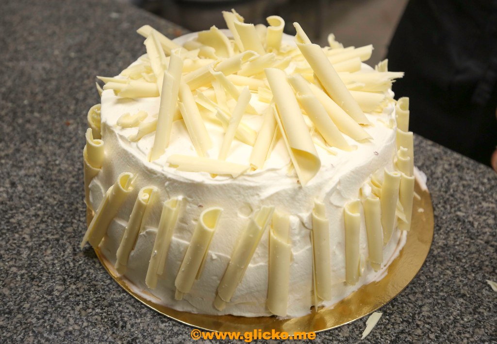 Till sist så garnerar han med chokladpennorna han gjorde tidigare. Snövitstårtan blir så vacker och jag kan berätta att den blev magiskt god.