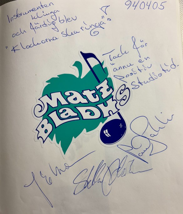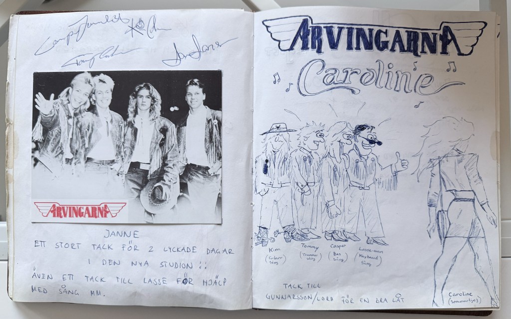 Jag hade även en gästbok som alla fick skriva i som var i studion och spelade in och jag minns speciellt att Arvingarna var så duktiga på att rita.