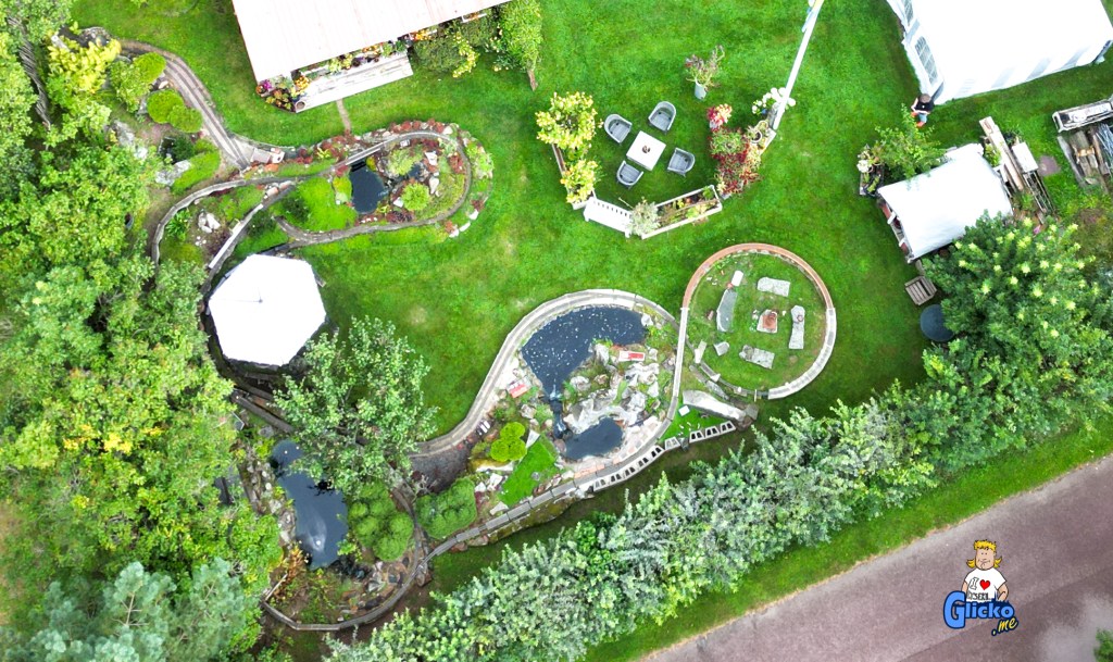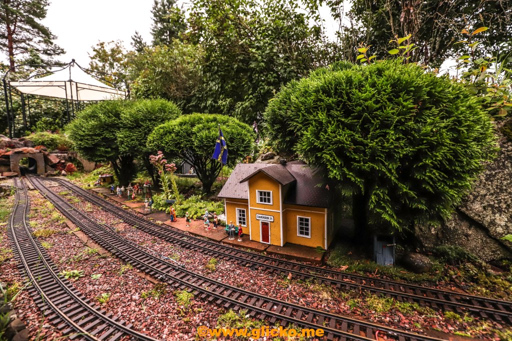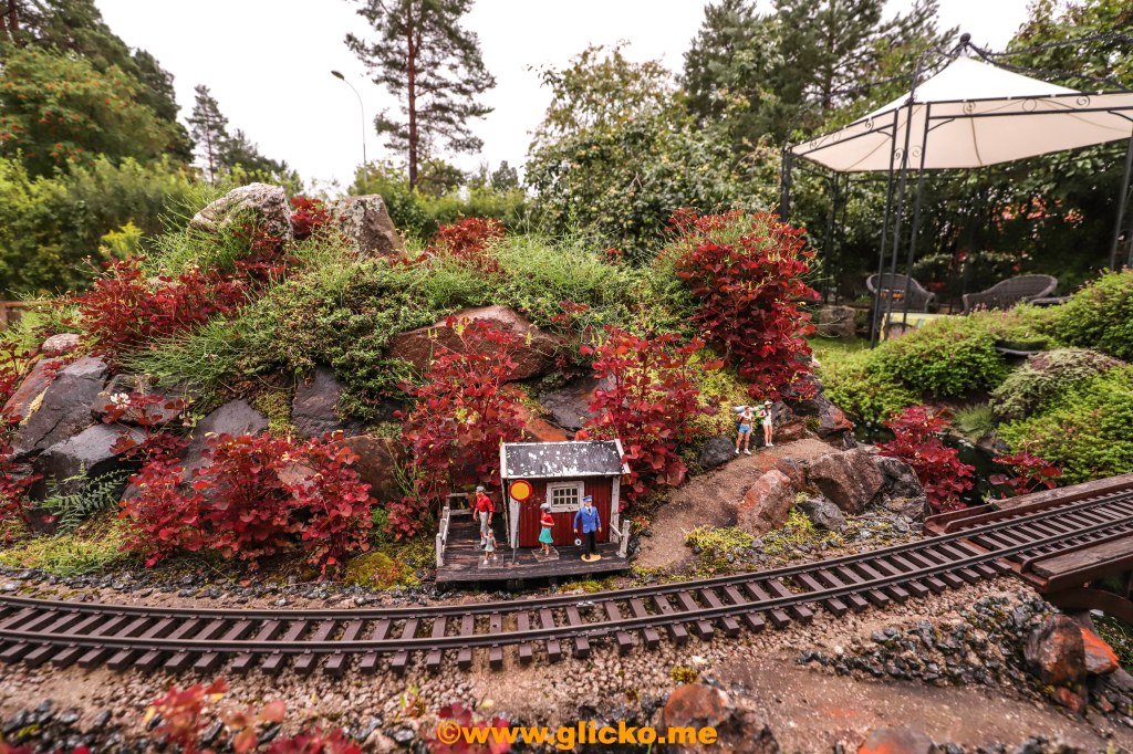 Runt banan finns det 350 figurer och inne ligger det 300 till som skall ställas ut efter att de fått ordning på vissa ställen. Från att ha varit en platt gräsmatta så har de byggt upp olika scener i sin trädgård med tågstation och massor av figurer och scener på området. När jag hälsar på så berättar de om att de skall börja med att göra ordning en del på sin järnväg där rundeln är.