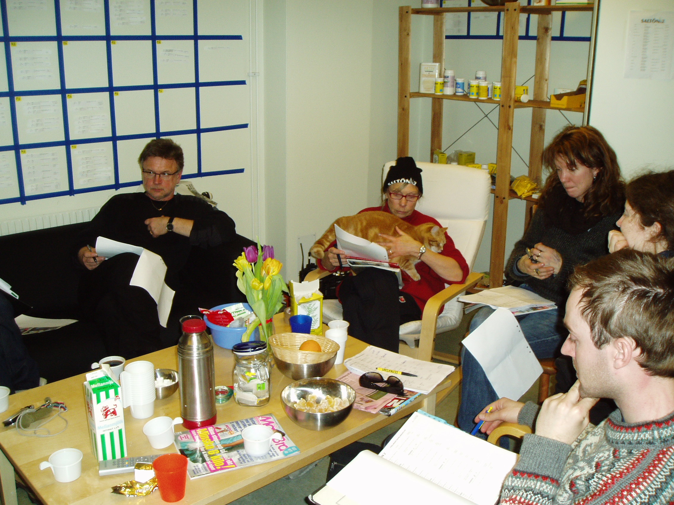 Här är bl.a. delar av inspelningsteamet med Carin Mannheimer med katten Clinton i sitt knä. Foto: Maria Magnusson.