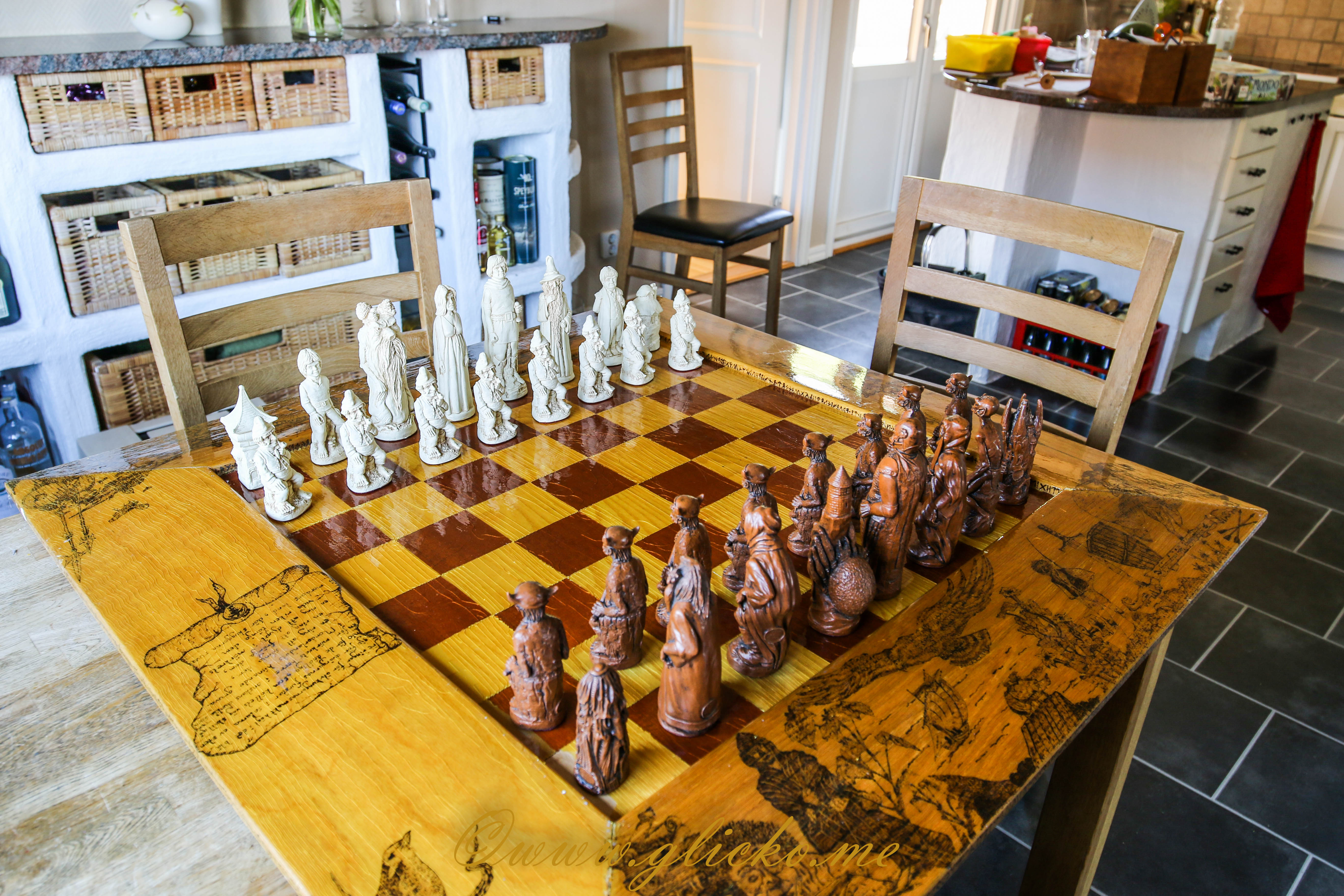 Mikael förvinner några minuter till källaren och hämtar upp ett schackbräde som han tillverkat. Schackbrädet är en inspiration från ”Sagan om ringen” berättar han. Brädet har han tillverkat själv, och figurerna har han fått av sin bror i present. De är inköpta i USA och är figurer från filmerna. Den ena sidan är den goda och den andra den onda berättar Mikael vidare. Han är fascinerad av ”Sagan om ringen”, och hade en del spillbitar i mahogny och ask. På så sätt kom brädet till, och på brädet finns det olika figurer från ”Sagan om ringen”. När brädet står i källaren har lacken krackelerat. Det är ett antal hundra timmar bakom tillverkningen av brädet berättar Mikael.