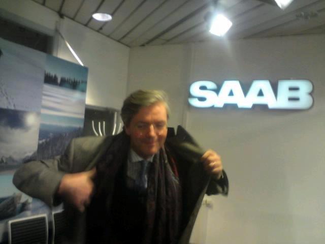 Här kommer vi in på Saab. 18 december 2009 minns han, då kom första regeringsbeslutet om Saab. Det hade varit mycket spekulationer och GM ville ju inte sälja Saab. Han berättar att han satt och åt en jullunch här i Lysekil som kyrkan hade. Då började telefonen ringa om att de skulle lägga ner Saab.