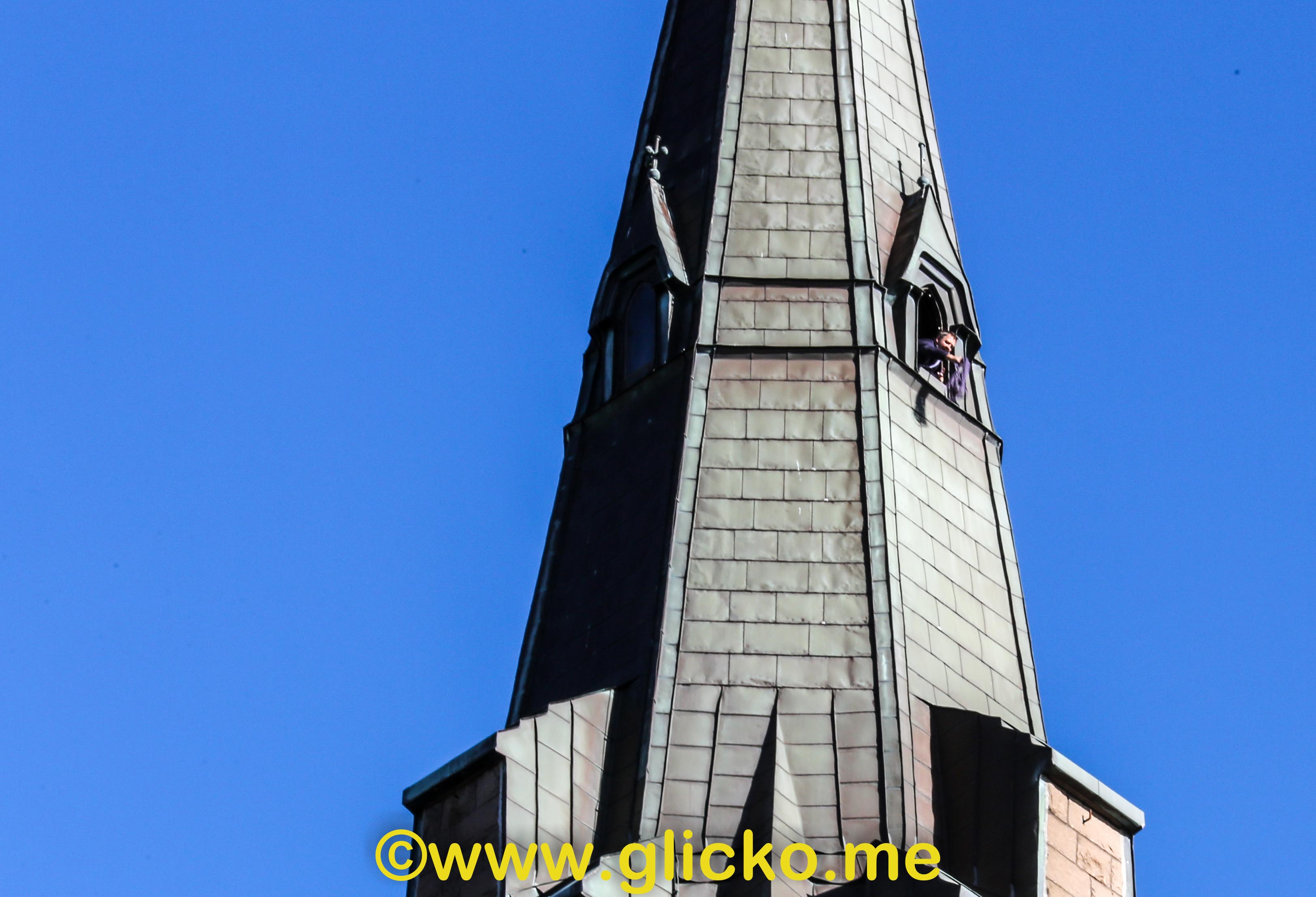Både Lars och Mikael är på plats för att kolla om det går att sätta upp visaren. De beger sig upp i kyrktornet. Efter en stund öppnas ett av fönstren. Jag kan berätta att det är väldigt spännande att stå och titta på detta. Lars ger klartecken att vinden är okej.