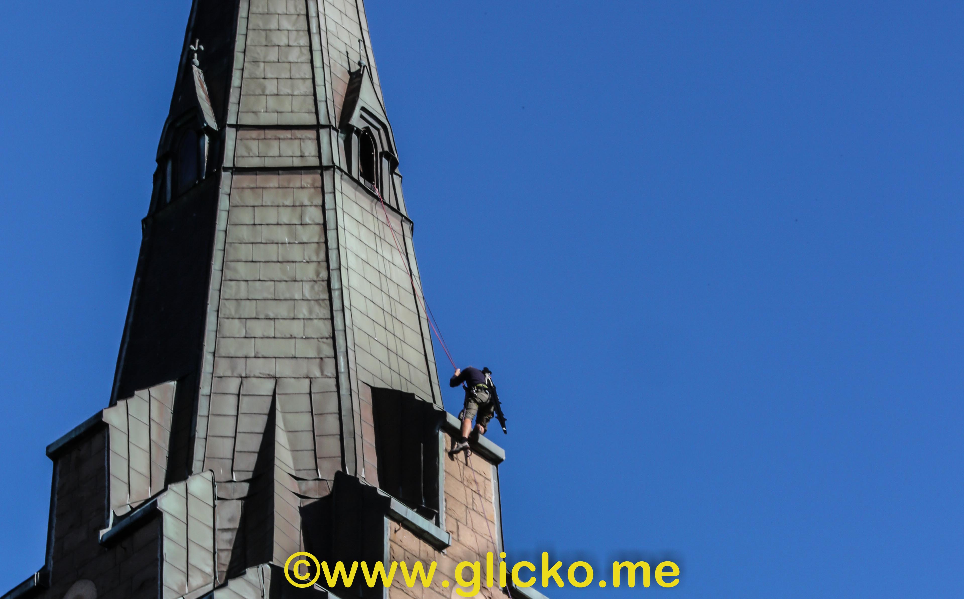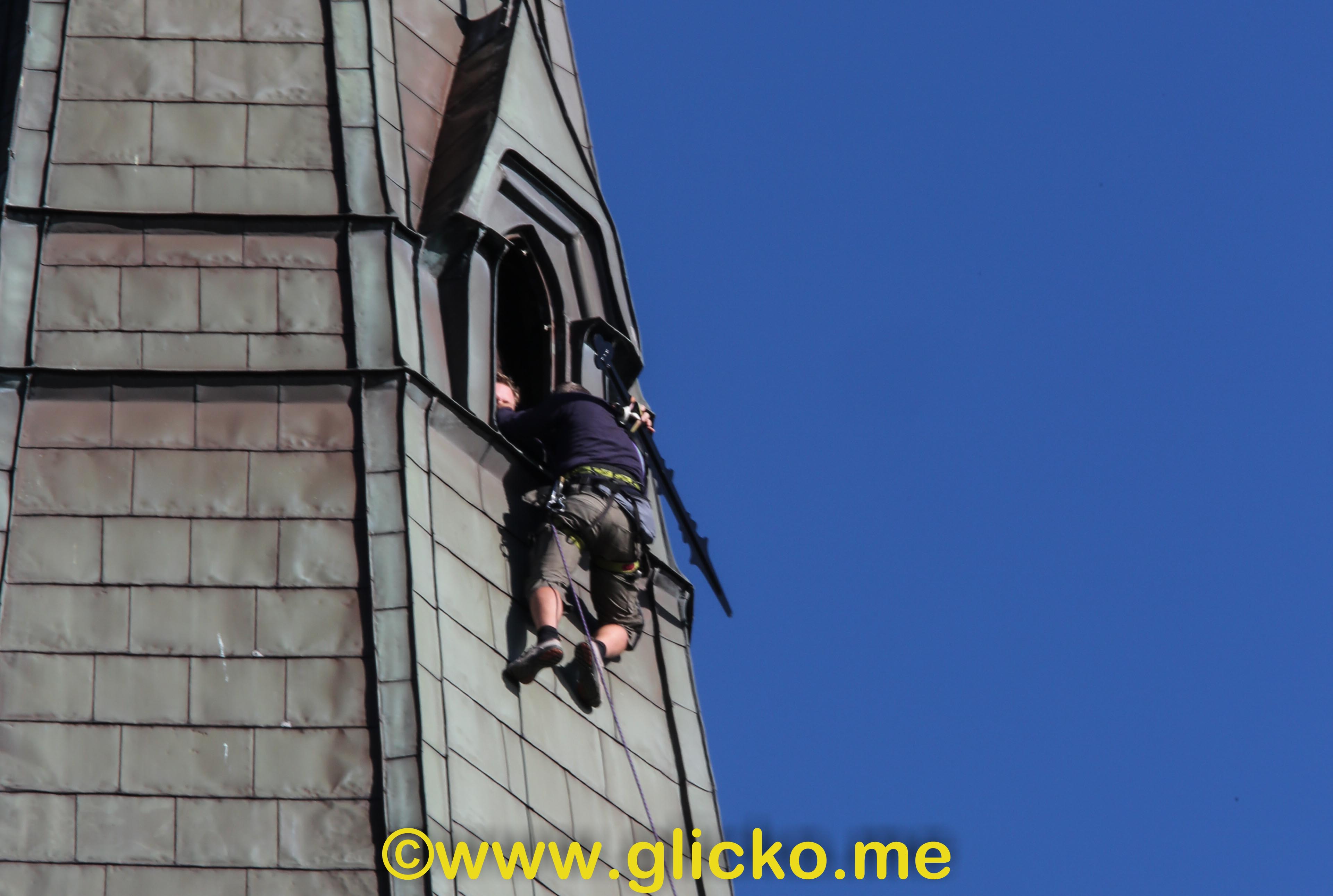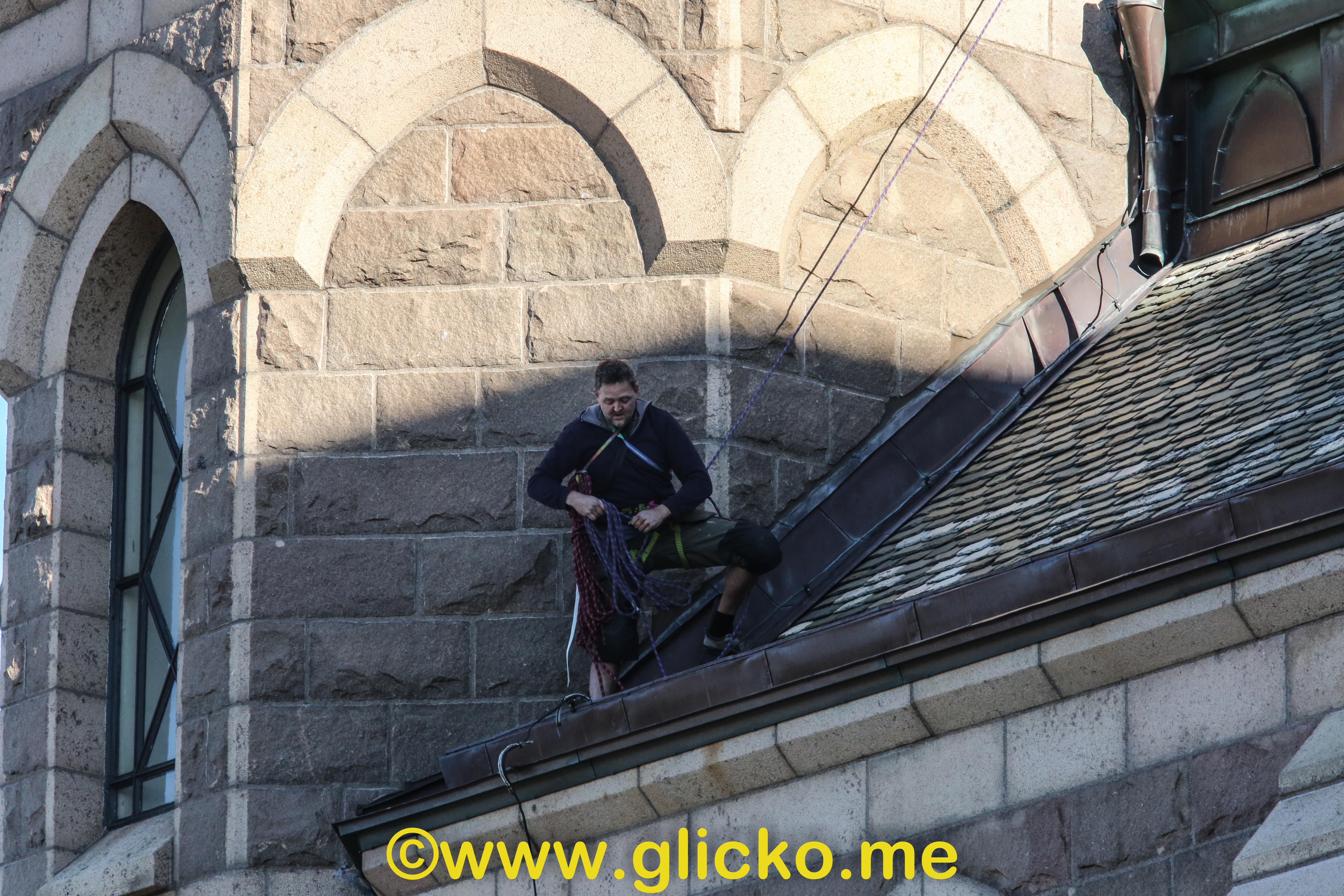 Efter att visaren är på plats så firar sig Lars ner till marken. För att det skall bli av så måste Lars först göra en bedömning om det går att genomföra och då är det vädrets makter som styr. Över 6-8 sekundmeter om det blåser åt fel håll så går det inte att genomföra och regnar det så blir det för halt på plåttaket som han glider ner på efter det at han klättrat ut genom fönstret.