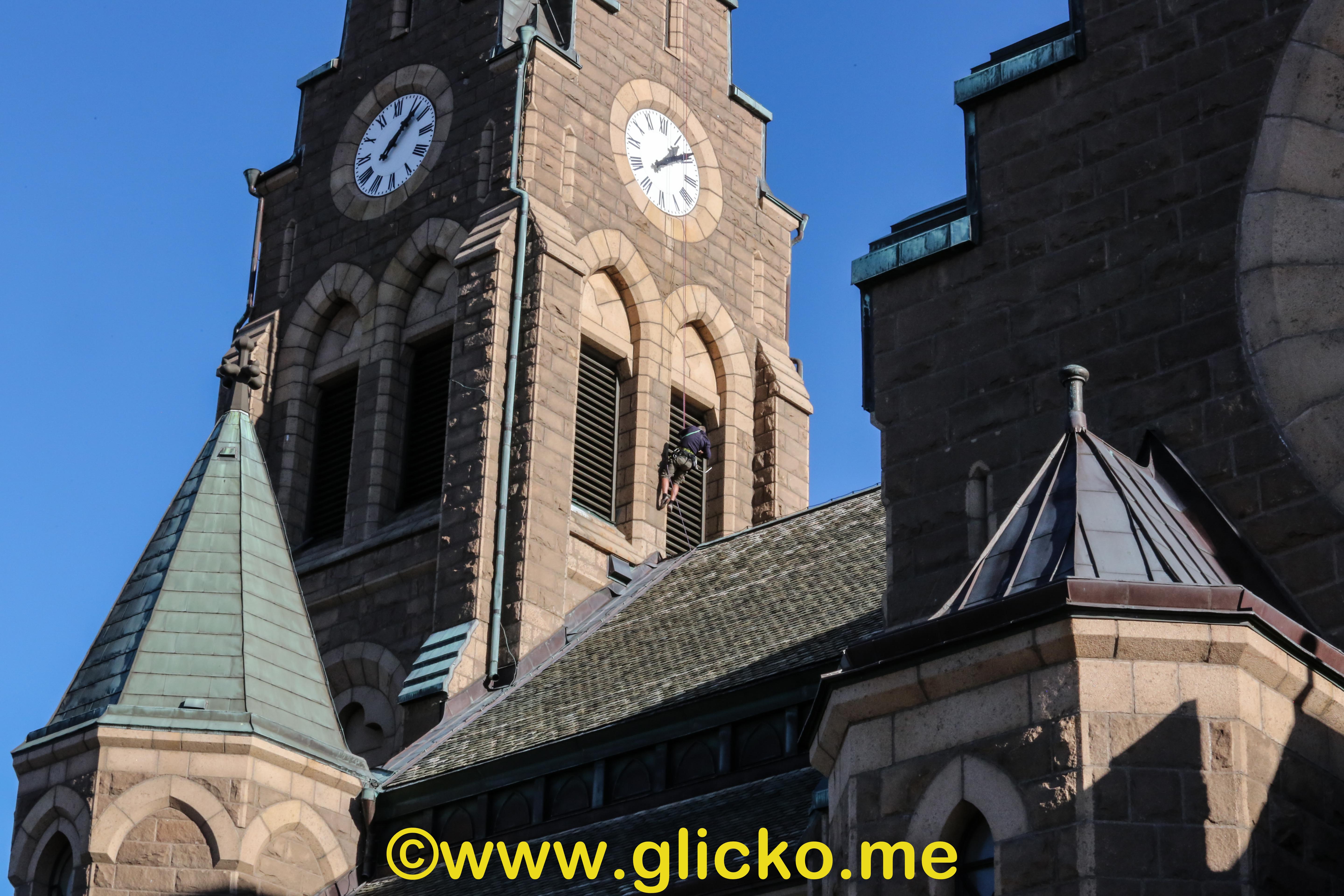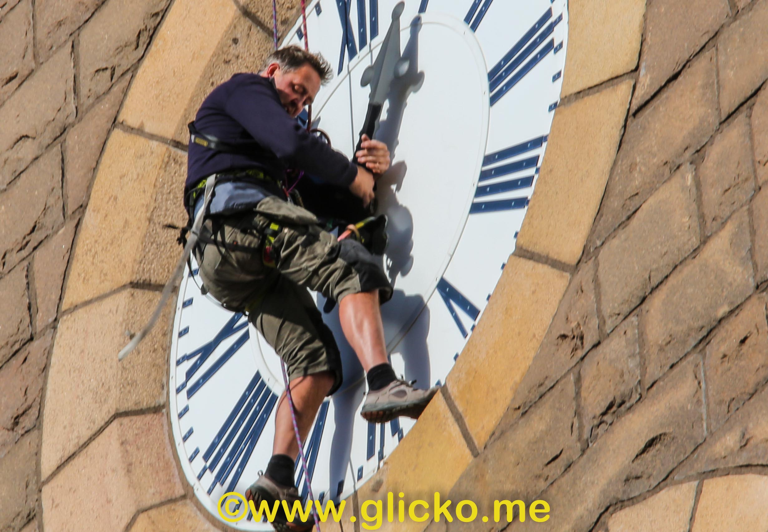 Han har en speciell grej med ett handtag som han tar hjälp av när han firar sig ner. När han låser handtaget så kan han jobba med båda händerna och behöver inte hålla sig fast i något rep. Sedan har han givetvis en sele på sig. Allt som allt så tar det cirka fem minuter att få visaren på plats när han väl hänger framför urtavlan tror Mikael.