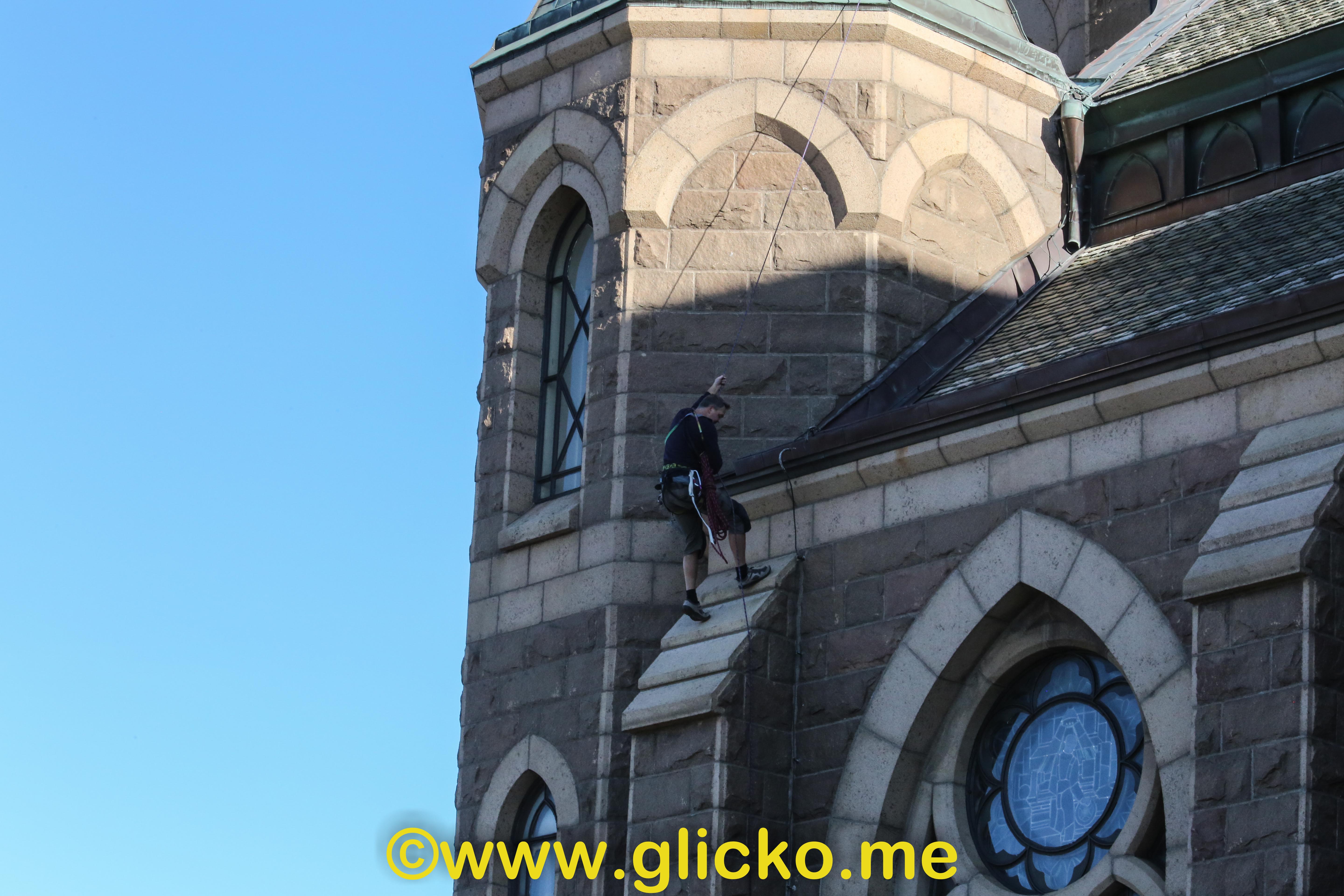 Säkerheten är jätteviktig när man gör något sådant här och där kommer Lars kunskap om säkerheten vid stuntjobb väl till hands. Repet som de använde förra gången sitter kvar i tornet. Sedan har de ett säkerhetsrep till som är godkänt för en vikt upp till två ton statisk belastning berättar Lars och det håller Mikael i.