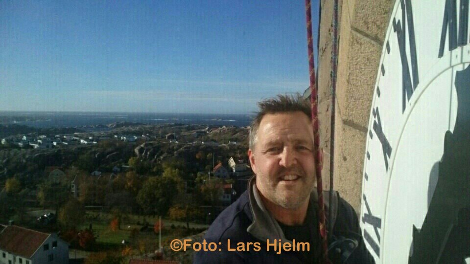 På plats fanns också Lars bror Mikael Hjelm. Mikael är kyrkogårdschef i Lysekil och berättar att visaren blåste sönder vid stormen Egons framfart i januari i år. När jag träffar de två bröderna så går de igenom säkerhetsdetaljerna och hur Lars skall få med sig visaren ner till själva urtavlan. Mikael tycker att det är bäst att Lars har den på ryggen när han hissas ner.