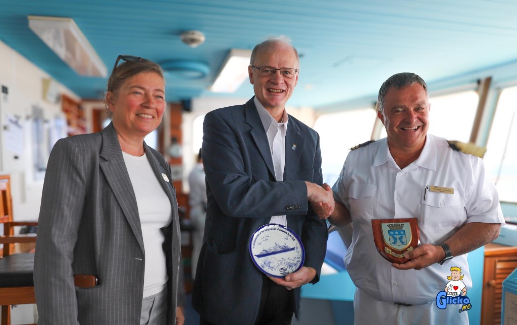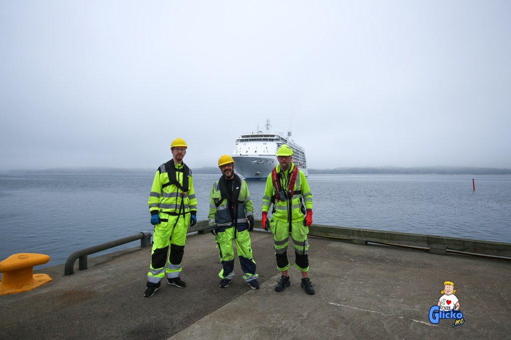 Eftersom det var premiäranlöp för M/S Seven Seas Voyager så fanns representanter från Lysekils kommun Jan-Olof Johansson och Karolina Samuelsson och överlämnade en plakett tillsammans med Peter Eriksson Operations Manager på SDK Shipping AB lämnade över en gåva som Heléne Berghult på Bohuslänska Sjöbodar tillverkat.