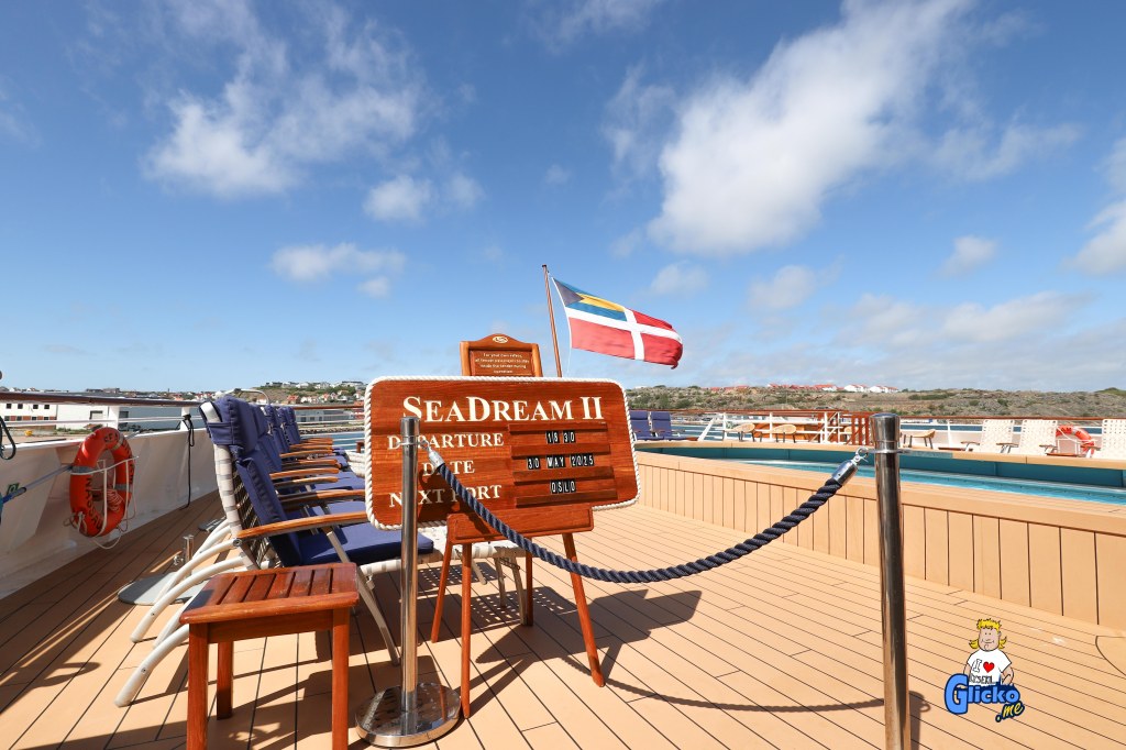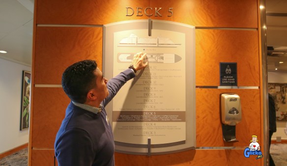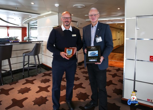 När vi kom ombord så träffade vi Assistant Cruise Director Patricio som tog oss upp några våningar där överlämnandet av plaketten skull ske. Det bjöds även på något att dricka och tilltugg till detta.
