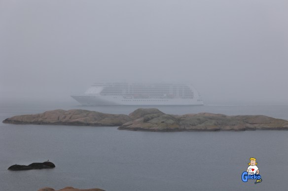 Utanför Lysekils så fanns som vanligt lotsarna från Brofjorden Pilot Station färdiga att gå ombord och föra kryssningsfartyget till kajen vid Grötö, och det kan inte varit lätt i denna dimman som var. Ungefär vid niotiden fanns M/S Seven Seas Voyager vid Grötö. Senare nu på eftermiddagen kom solen fram i Lysekil .