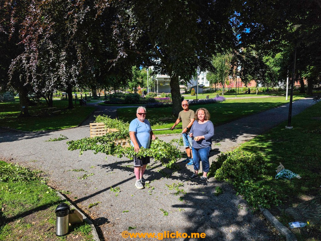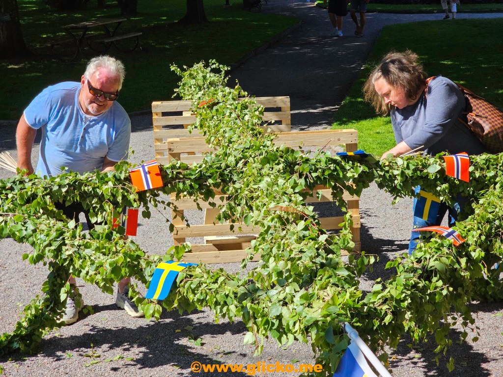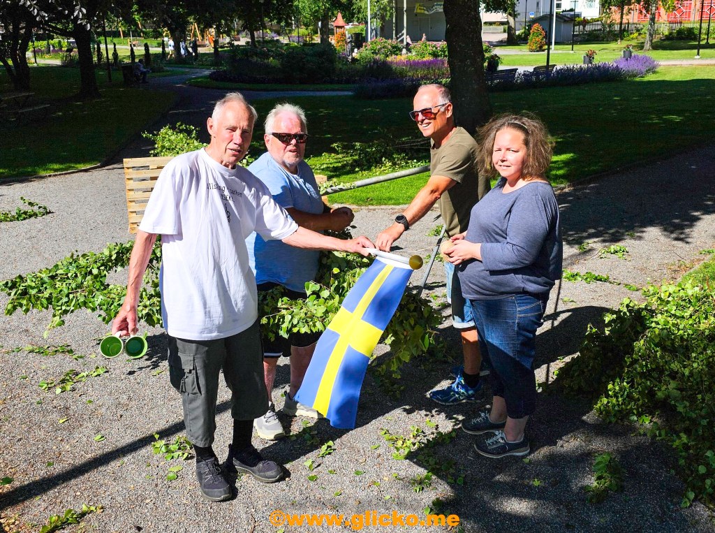 Redan kl. 08:00 var det årliga gänget på plats och började klä midsommarstången. Det var Roar, Bengt och Merete som klädde den vackra midsommarstången.
