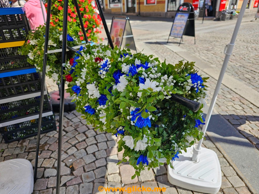 På torget kunde man bland annat köpa jordgubbar och midsommarkransar för både små och stora huvuden.