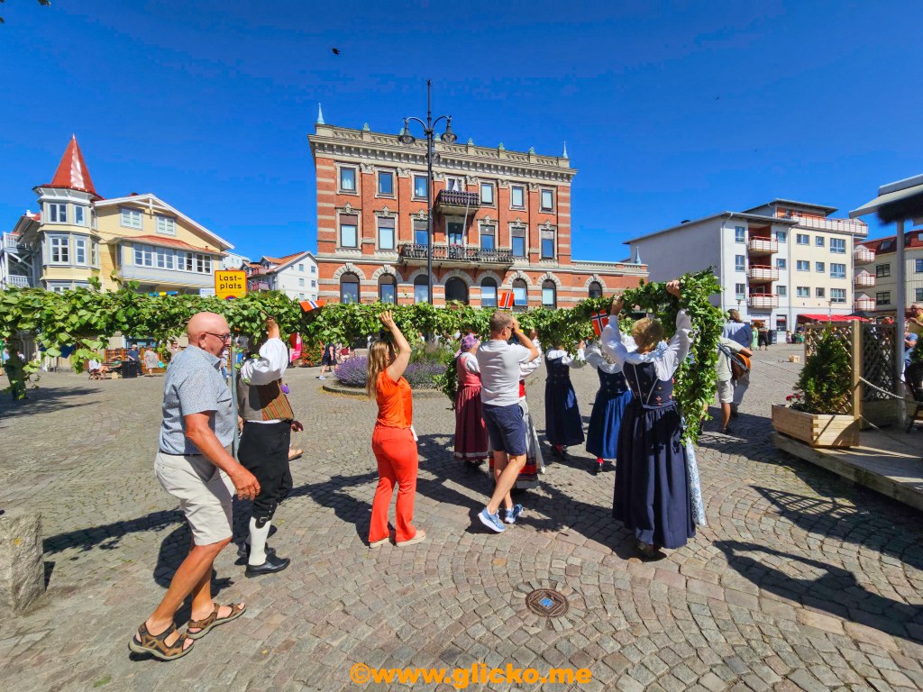 Kl. 11:00 så var det dags för promenaden med stången upp till Kungstorget från stadsparken. Med härlig musik så tog Lysekils Folkdansgille + några frivilliga och hjälpte till att få stången på plats. Efter att stången kommit på plats så blev det dans runt midsommarstången.